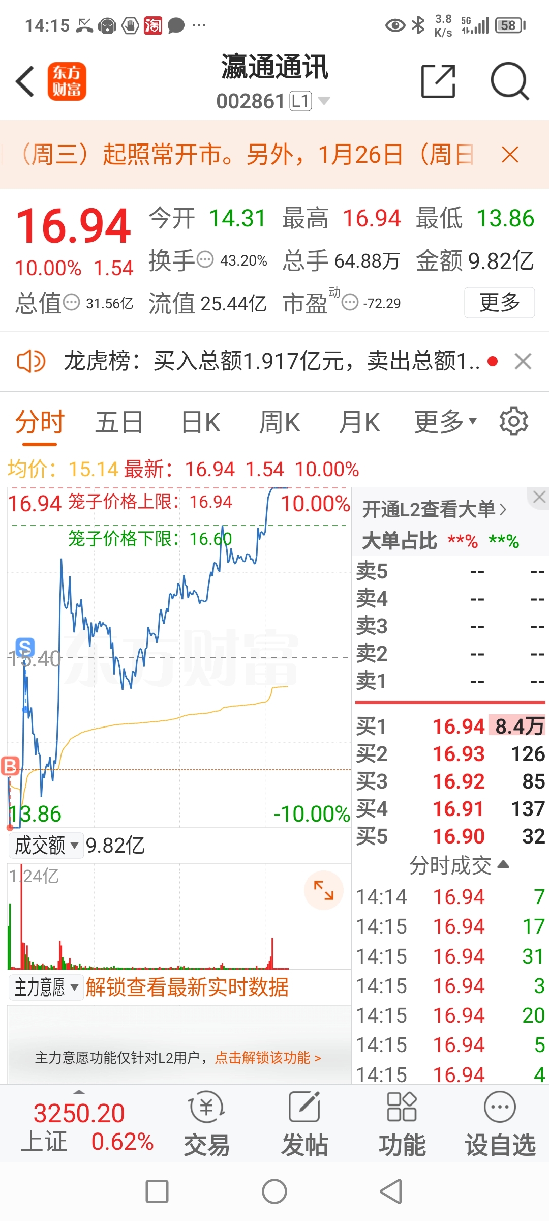 $瀛通通讯(SZ002861)$ 昨天跌停板买了500股,今天低开又在跌停板买了500股,拉回到九个点卖掉昨天的500股,今天的500股周一继续吃鸡腿