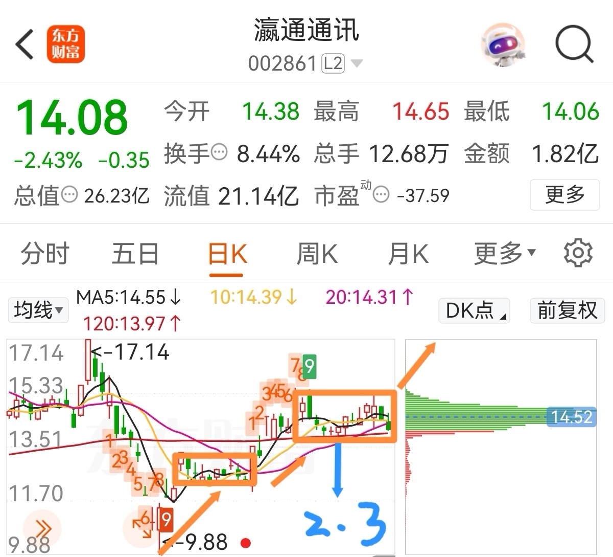 瀛通主力非常狡猾,专门吊打技术流,连续三天站上箱体上沿都没让它站稳,又跌回箱体内,目前箱体下沿13.94,没跌破就继续观察呗,想从这主力嘴里抢口肉,真是不容易啊