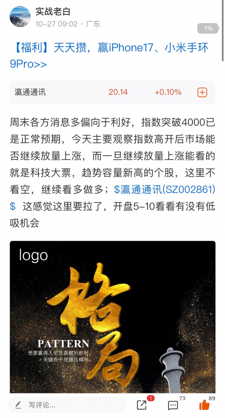 指数缩量新高突破4000,整体盘面走的很健康,该分歧的分歧,该轮动的轮动,临近午盘金融方向异动,由于盘面缩量金融拉升后科技顺势回落,下午进指南针,昨天分享$瀛通通讯(SZ002861)$ 落袋为安