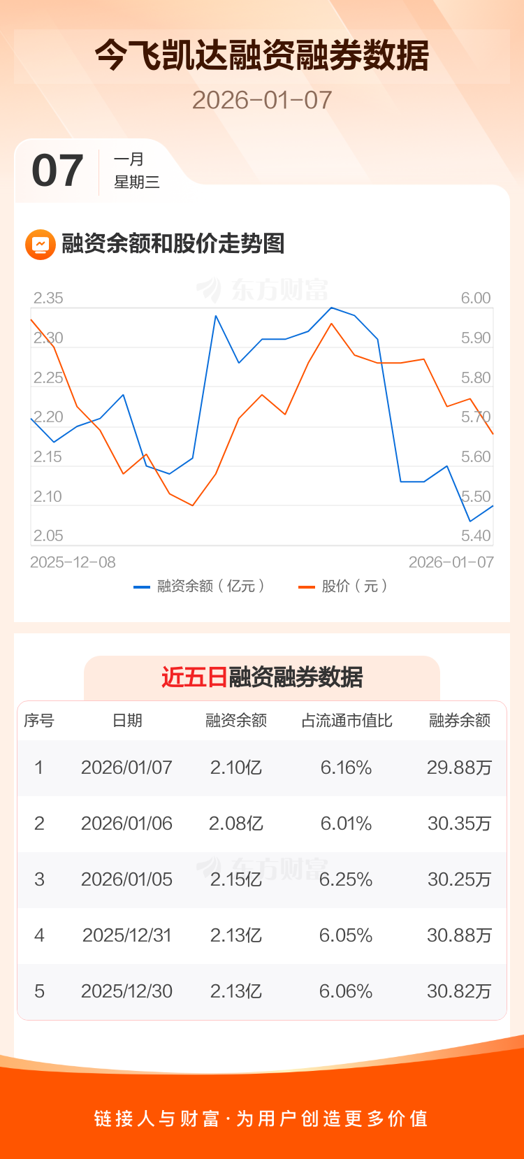 交易所最新数据显示,今飞凯达于2026年1月7日获融资买入1756.79万元,融资偿还1569.63万元,当日融资净买入187.17万元。目前,该股融资余额2.10亿,占流通市值比例为6.16%。