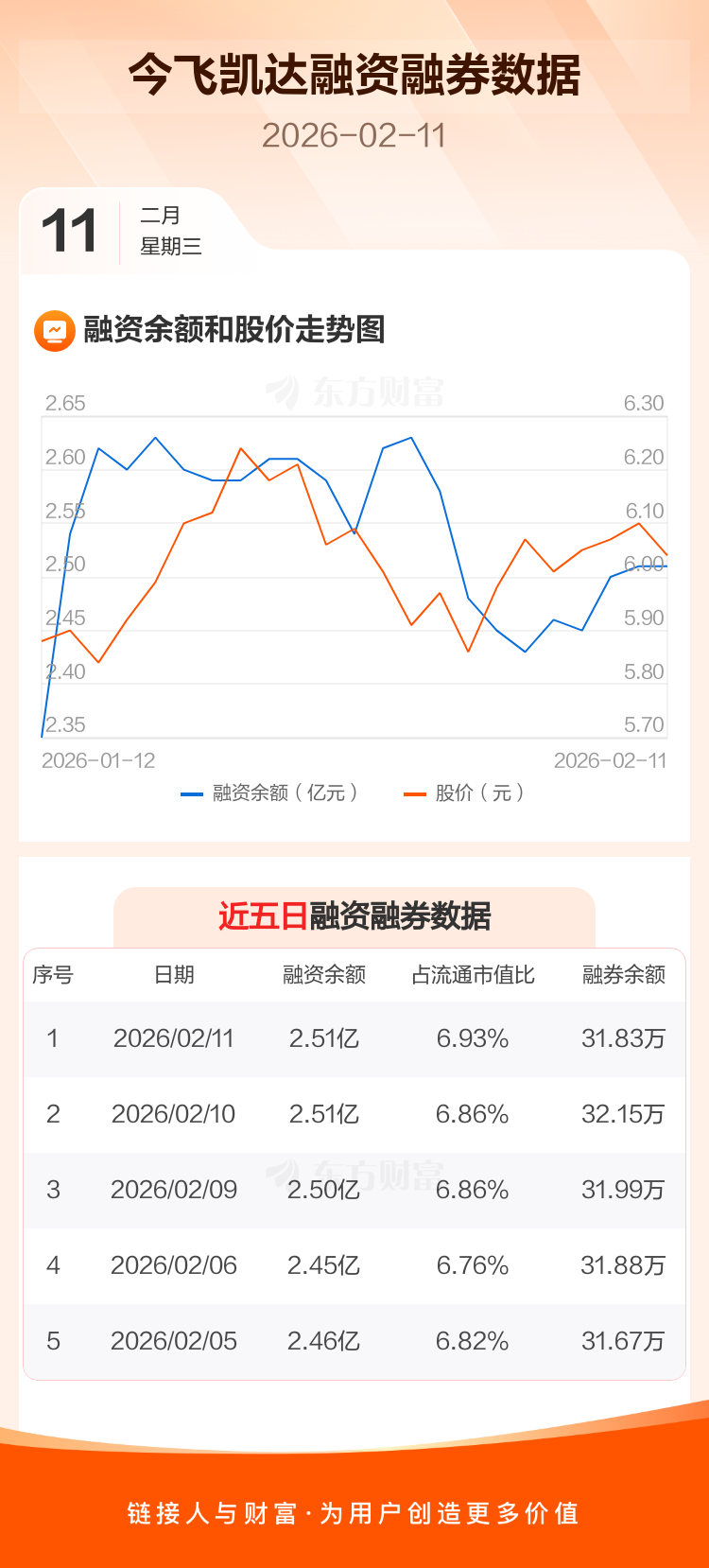 交易所最新数据显示,今飞凯达于2026年2月11日获融资买入1193.73万元,融资偿还1171.21万元,当日融资净买入22.53万元。目前,该股融资余额2.51亿,占流通市值比例为6.93%。