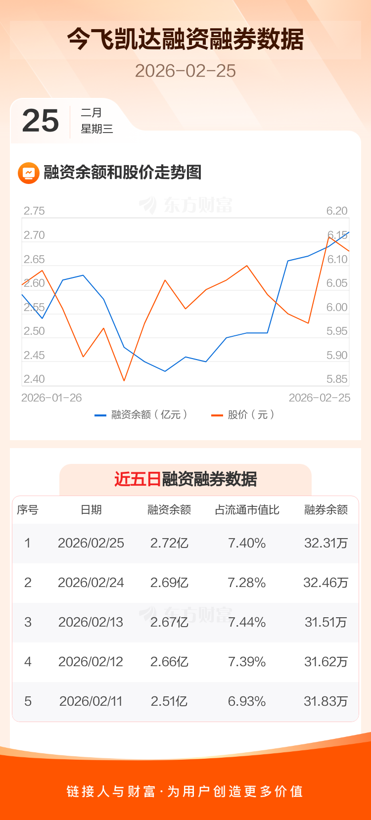 交易所最新数据显示,今飞凯达于2026年2月25日获融资买入1461.85万元,融资偿还1126.02万元,当日融资净买入335.84万元。目前,该股融资余额2.72亿,占流通市值比例为7.40%。