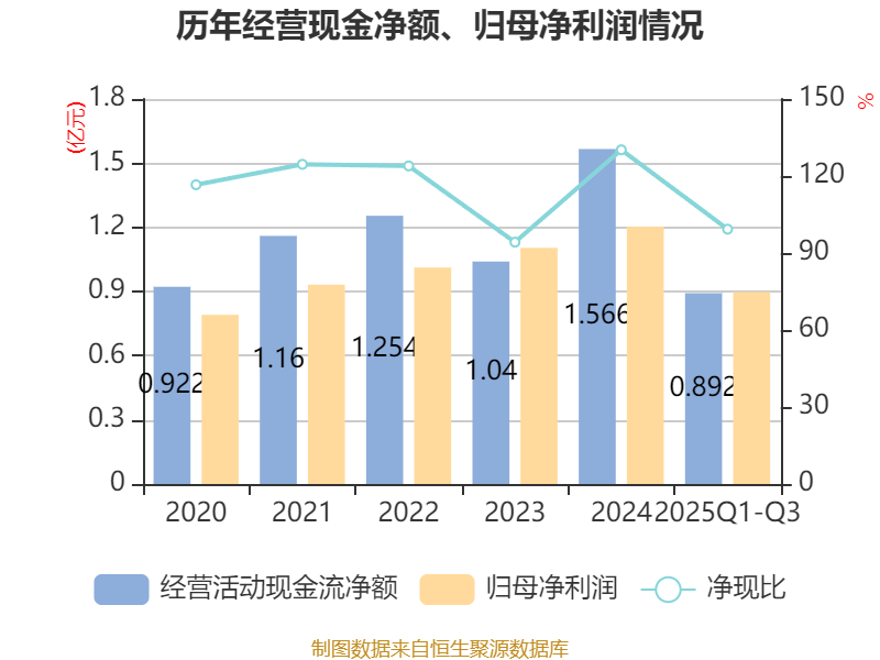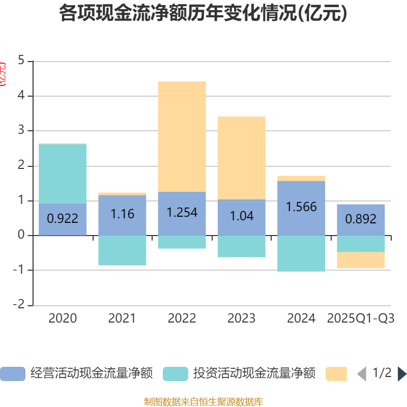2025年前三季度,公司经营活动现金流净额为8915.59万元,同比下降30.54%;筹资活动现金流净额-4609.34万元,同比减少5926.53万元;投资活动现金流净额-4780.8万元,上年同期为-7933.98万元。