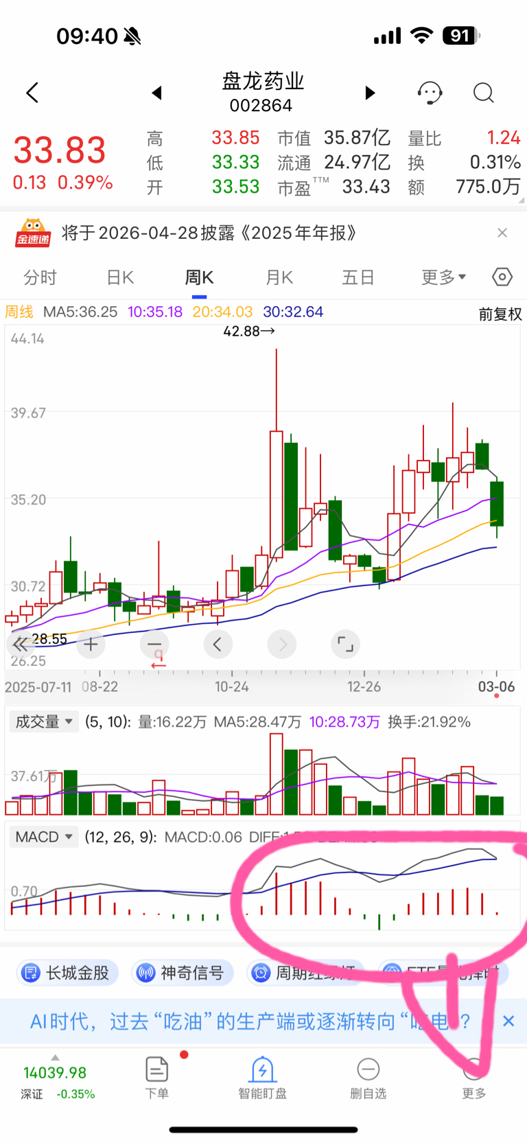 $盘龙药业(SZ002864)$ 大家不要上当。周线调整没有结束。周线macd要奔着死叉去走了。起码等到周线第三个绿柱出来。才算安全。现在买的都会被套。