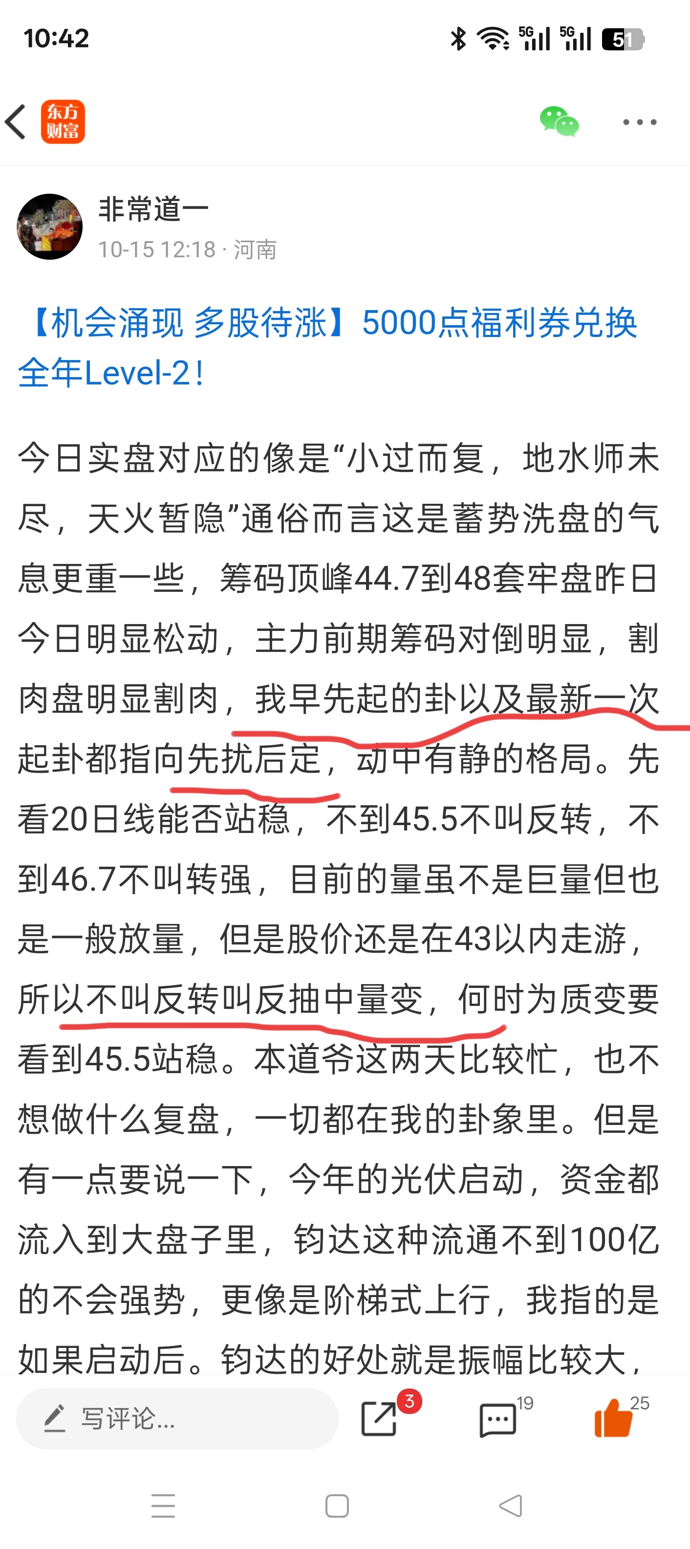 $钧达股份(SZ002865)$ 指数跌,板块跌,个股跌,昨天的缩量不是钧达一个人,是整个市场都缩量,因为利空消息没确认,今天的表现就是利空表现,指数跌了百分之2,钧达百分之4,没到39,说明底部有支撑,我上次说了,并不是反转,反转要到45以上,只是反抽量变而已,高点各位可以卖出做t接回来,我也说了钧达并不会像其他大盘一样涨势凶猛,必须是阶梯式上行,他现在只是筹码松动,并没有自主启动,所以一切还是跟随市场的走势。今天道爷我又占卜一卦,主卦山地剥,变卦地雷复。目前的跌势确实在剥夺一切,今天割肉的散户不少,但是别忘了变卦的地雷复