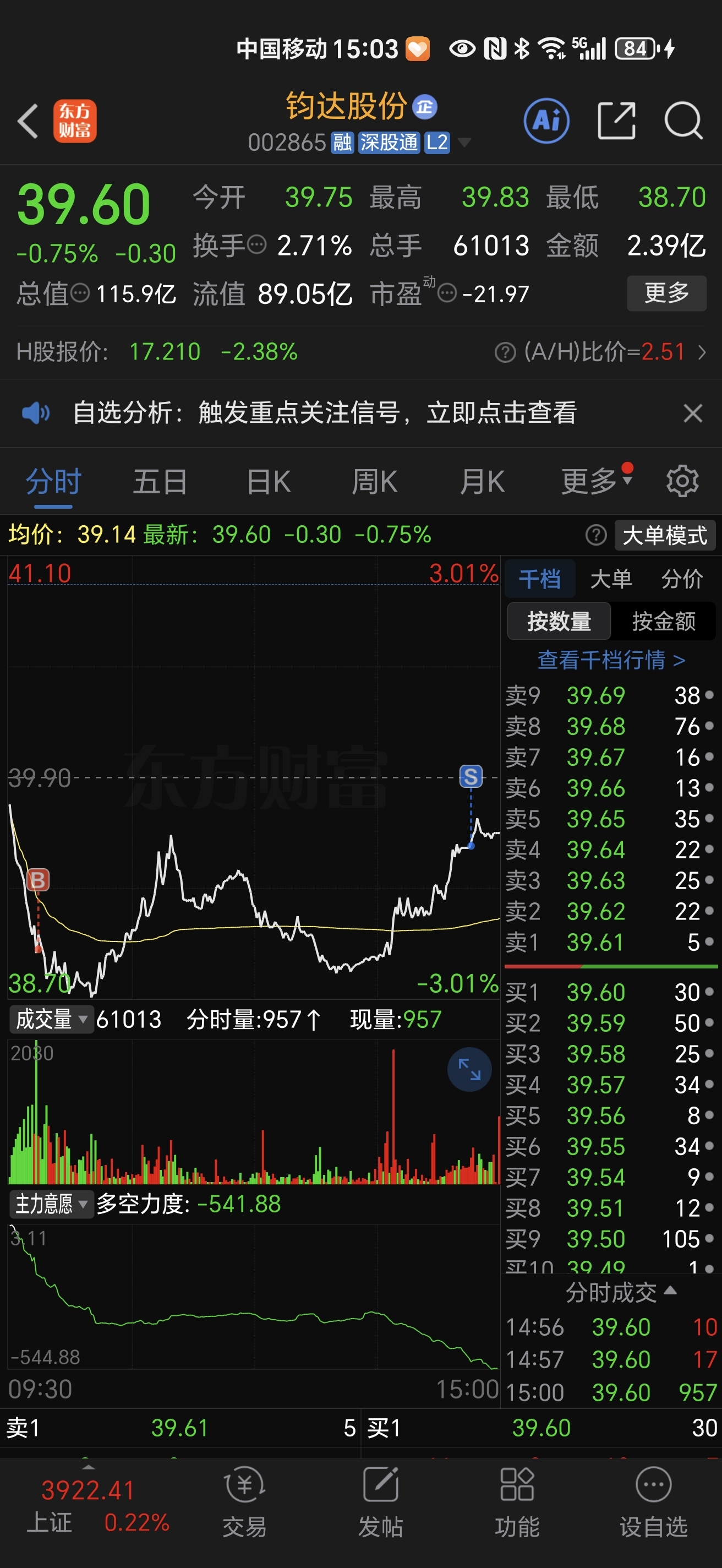 $钧达股份(SZ002865)$ 今天也算做了个小t,运气还不错,大盘也是守住了3900