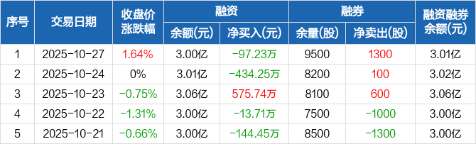 钧达股份:融资净偿还97.23万元,融资余额3亿元(10-27)