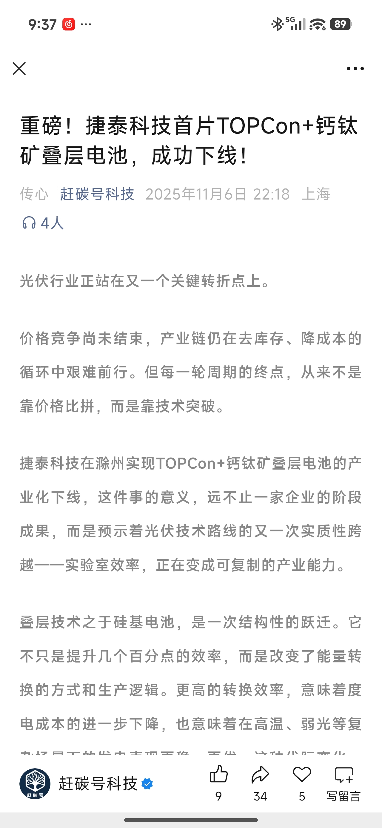 捷泰的钙钛矿叠层电池片产业化下线已经在光伏圈爆火了