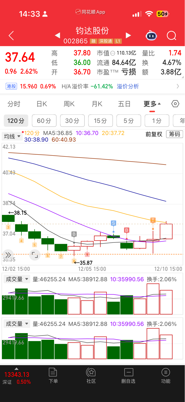 $钧达股份(SZ002865)$ 今天拉上是有很多带血筹码割肉了的,所以明天即使回调也会在37以上,最好的就是不要动,容易t飞。今天估计有不少人在下面t飞了。坚定持有先看到39