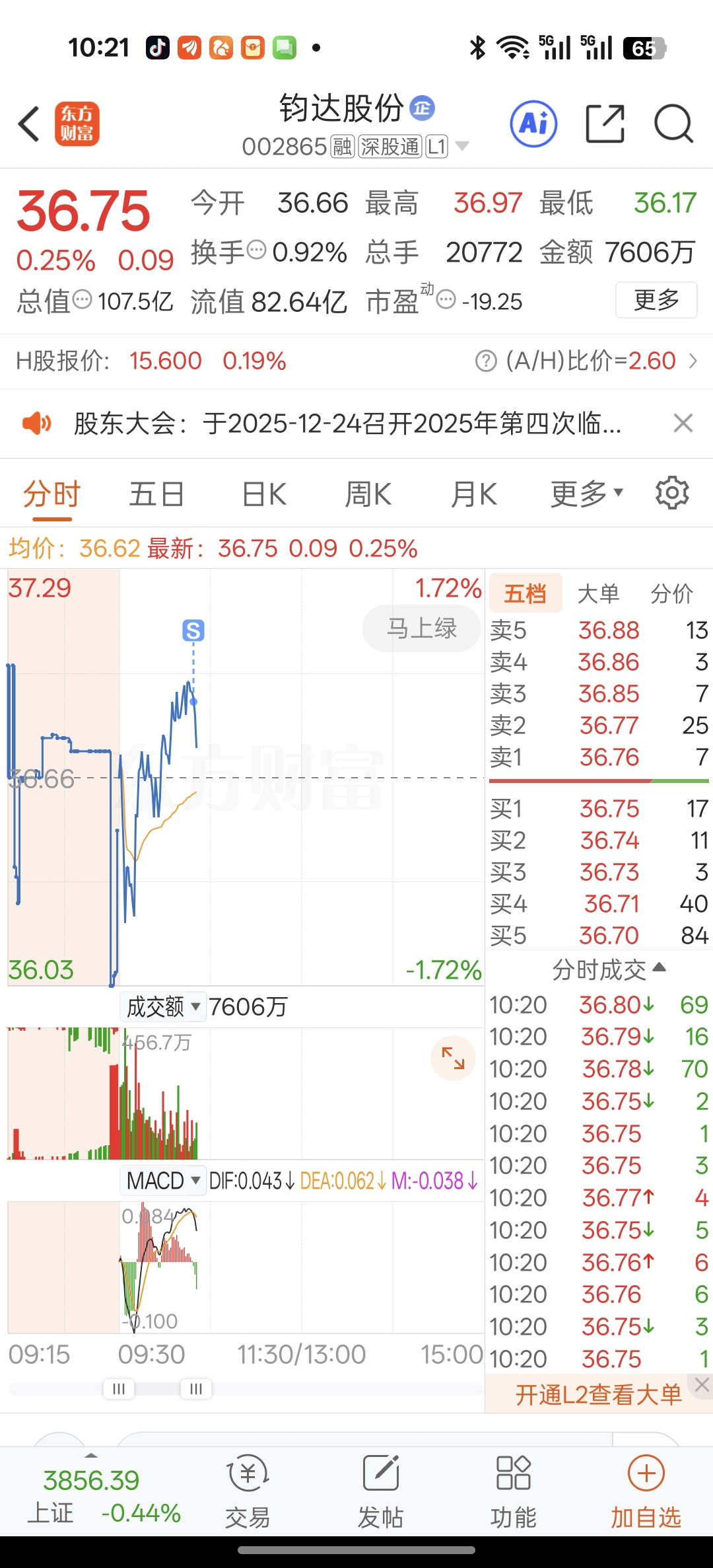 $钧达股份(SZ002865)$ 兄弟们昨天超底,今天又卖了,不好意思啊,38以上的别想着解套了
