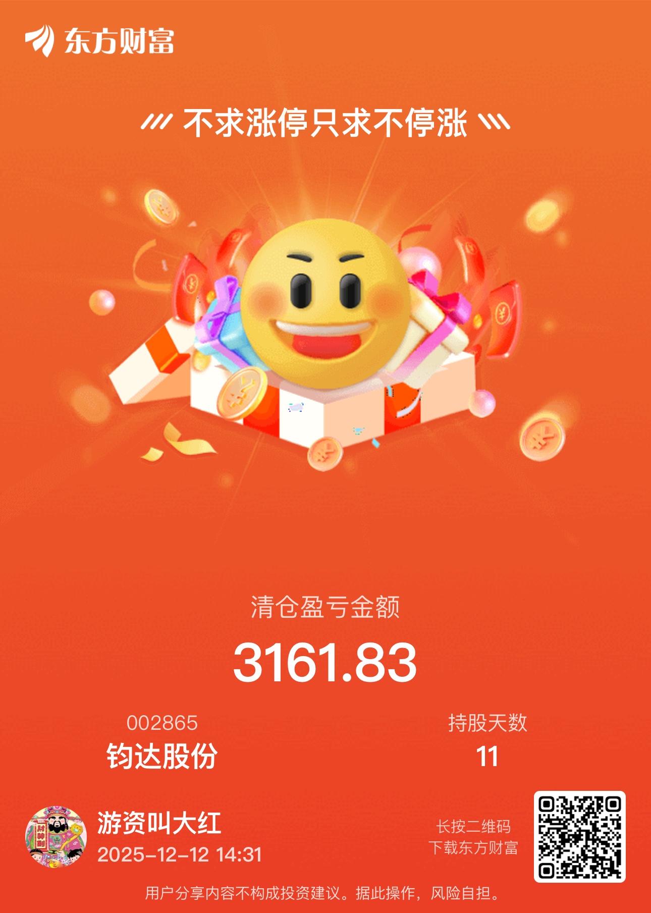 $钧达股份(SZ002865)$ 达哥,感谢给机会,我肯定会再回来看你的,小赚一点
