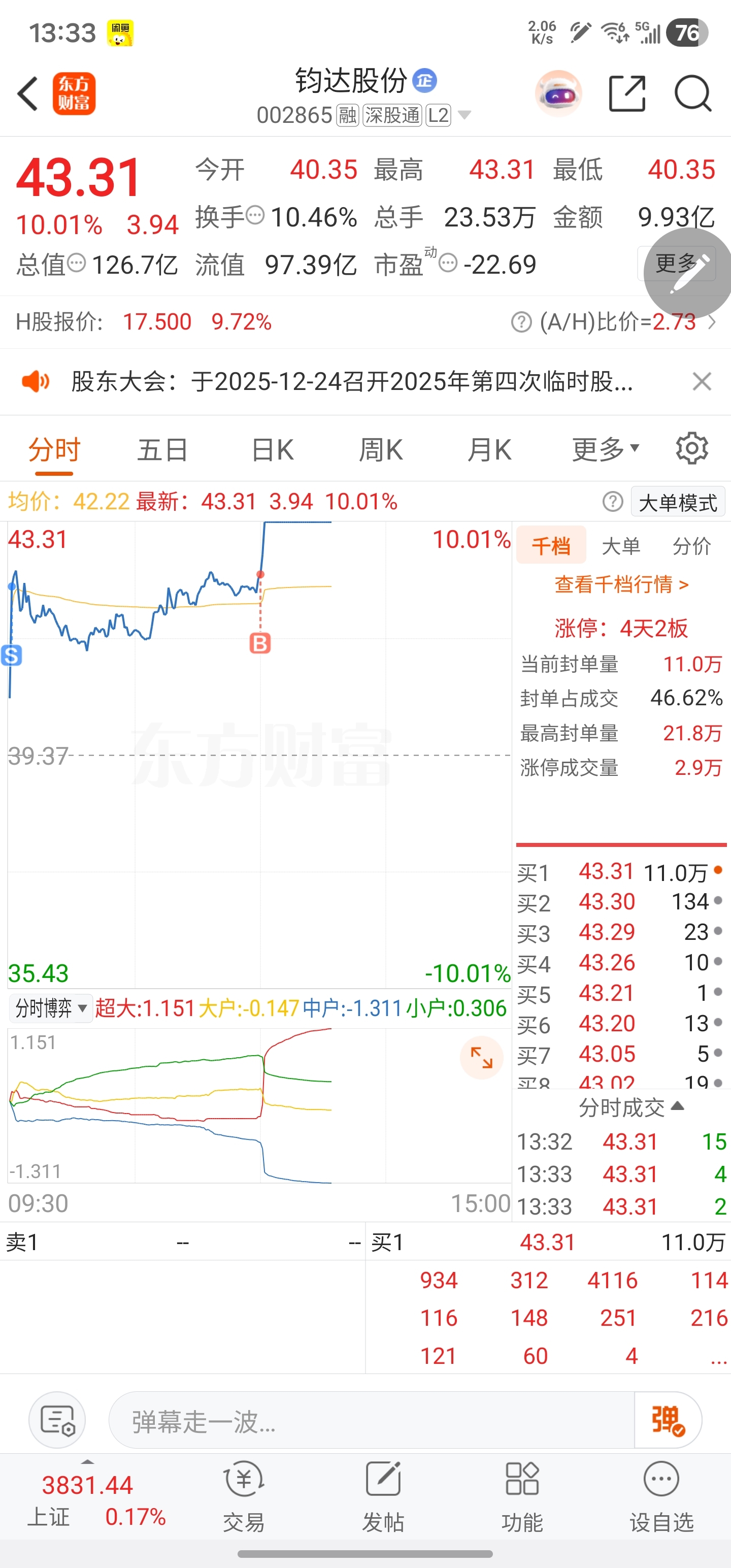 $钧达股份(SZ002865)$ 前天涨停我格局,5个点还加仓了,给我跌到一个点,昨天卖了一半,今天我不格局了,你给我这么强势,亏的时候满仓亏,赚的时候3分之一仓位,怎么玩