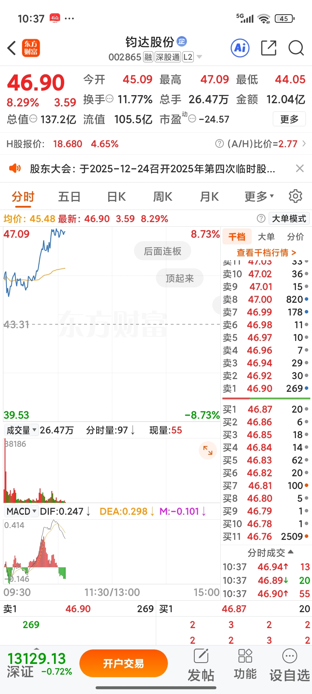 $钧达股份(SZ002865)$ 46.9元附近有做T机会