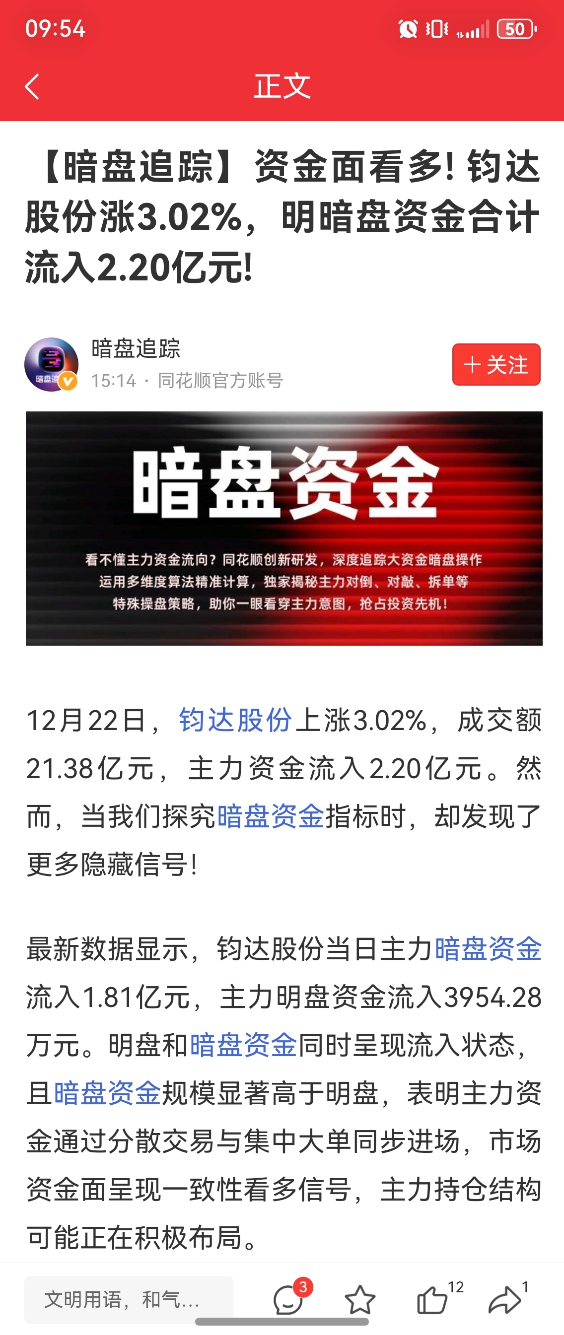 $钧达股份(SZ002865)$ 今天暗盘资金主力确实流入1.81亿,不过你们说的利好为啥都没看到公告来着