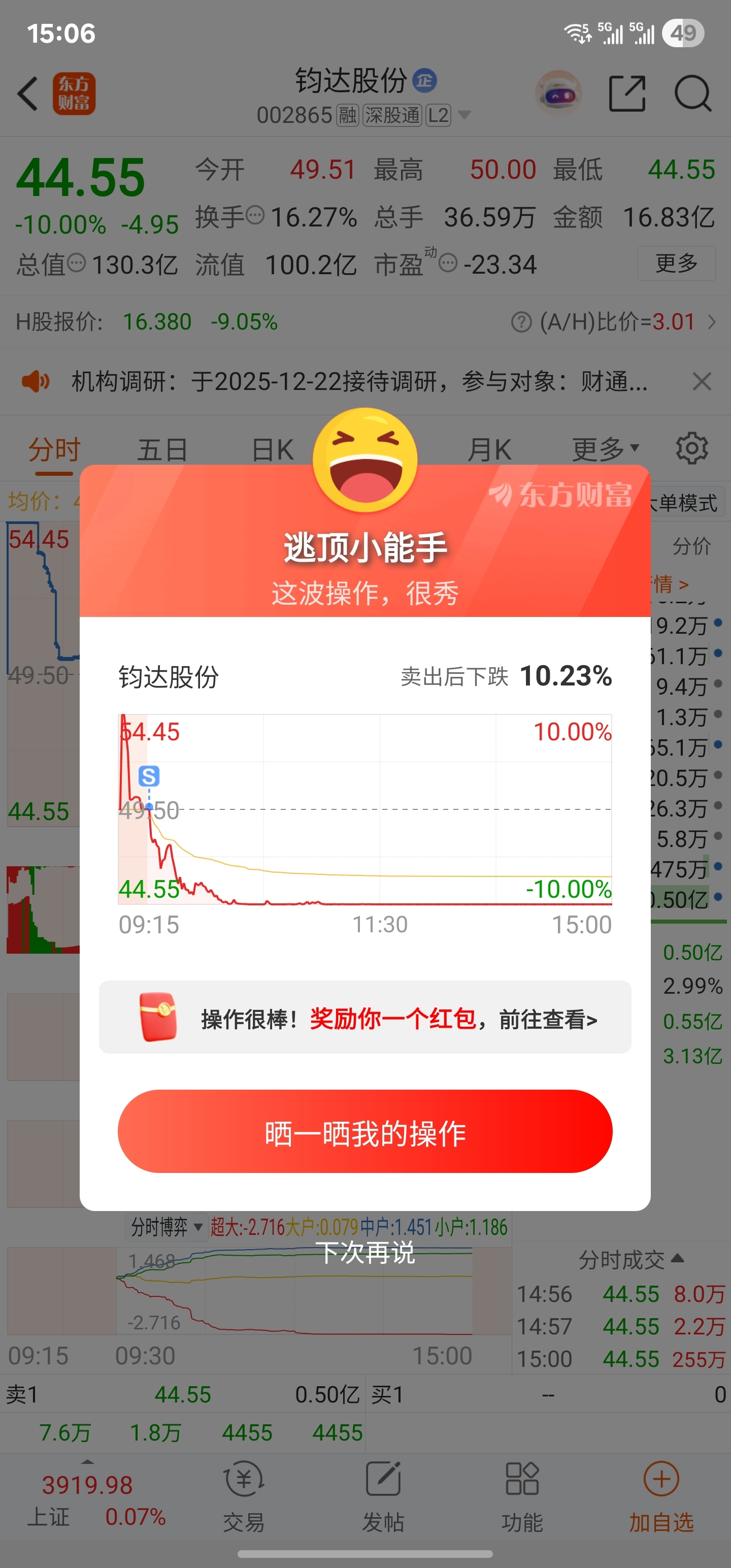 $钧达股份(SZ002865)$ 留下发财,胆子太小了,不敢拿