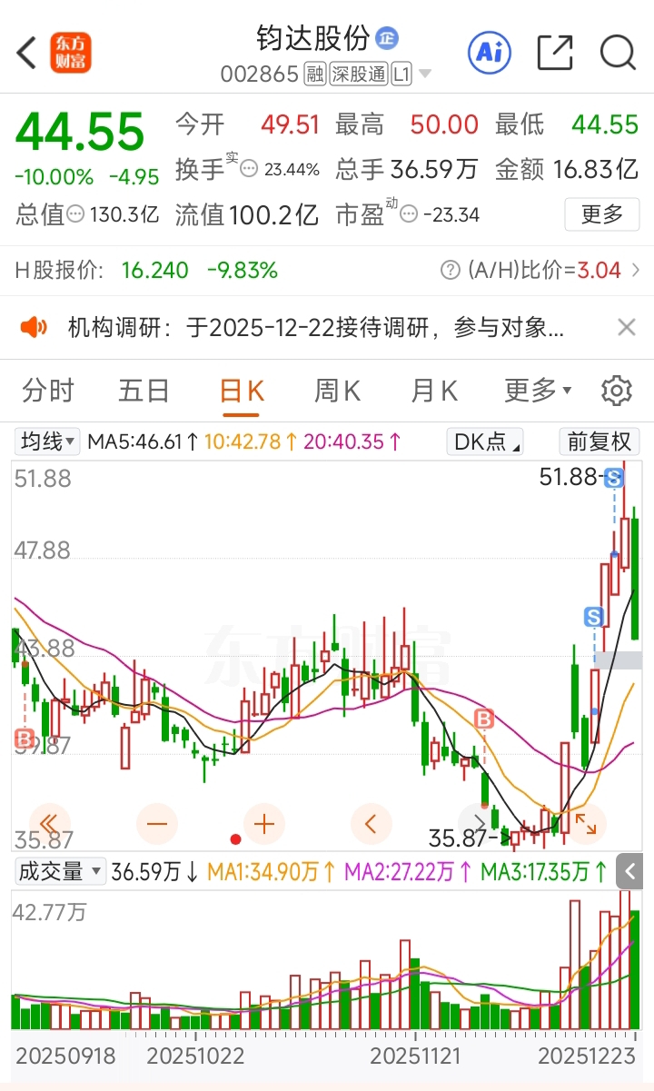 钧达股份,昨天还在拍大腿说卖飞了,今天一看,庆幸,跌停……