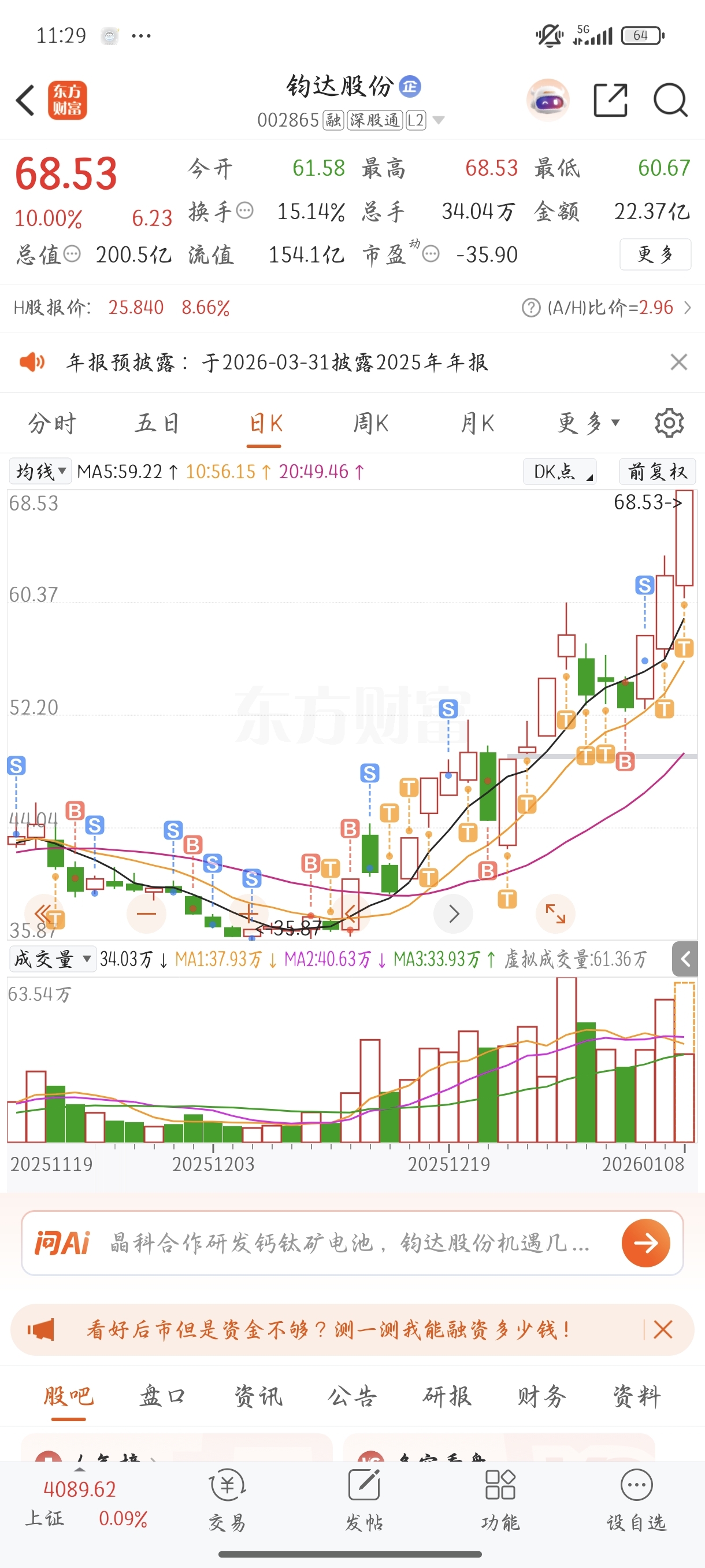 $钧达股份(SZ002865)$ 感谢均达主力