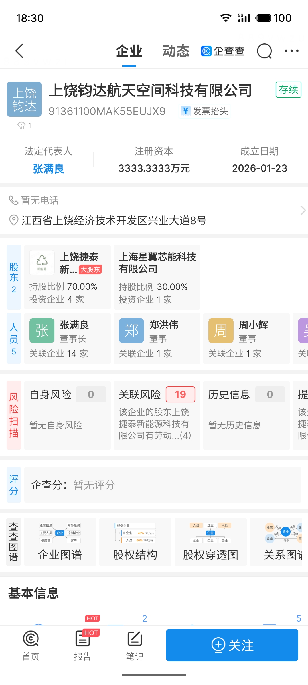 $钧达股份(SZ002865)$ 企查查显示钧达股份子公司上饶捷泰新能源科技有限公司占股70%,上饶钧达航天空间科技有限公司成立于2026.1.23,企查查显示钧达股份子公司上饶捷泰新能源科技有限公司占股70%,上海星翼芯能科技有限公司占股30%