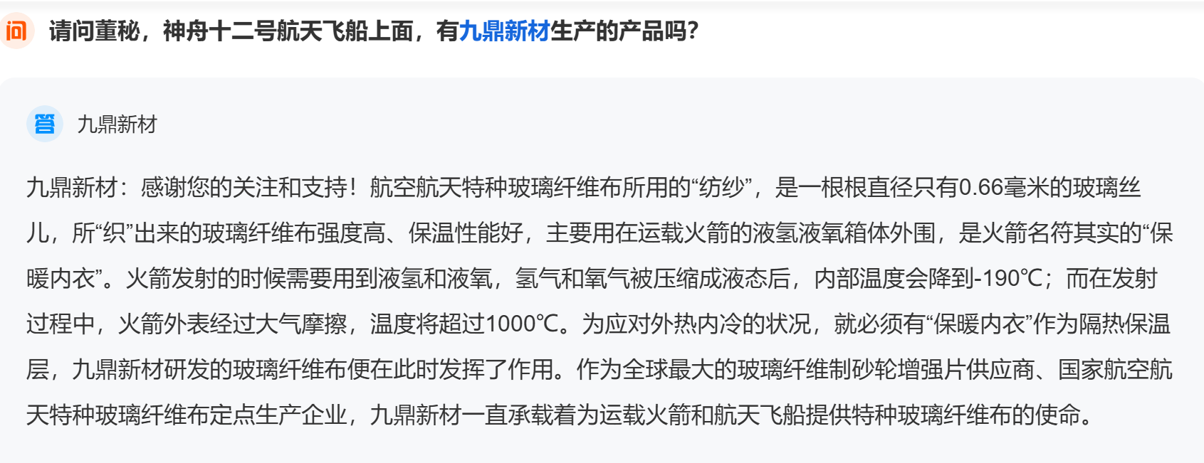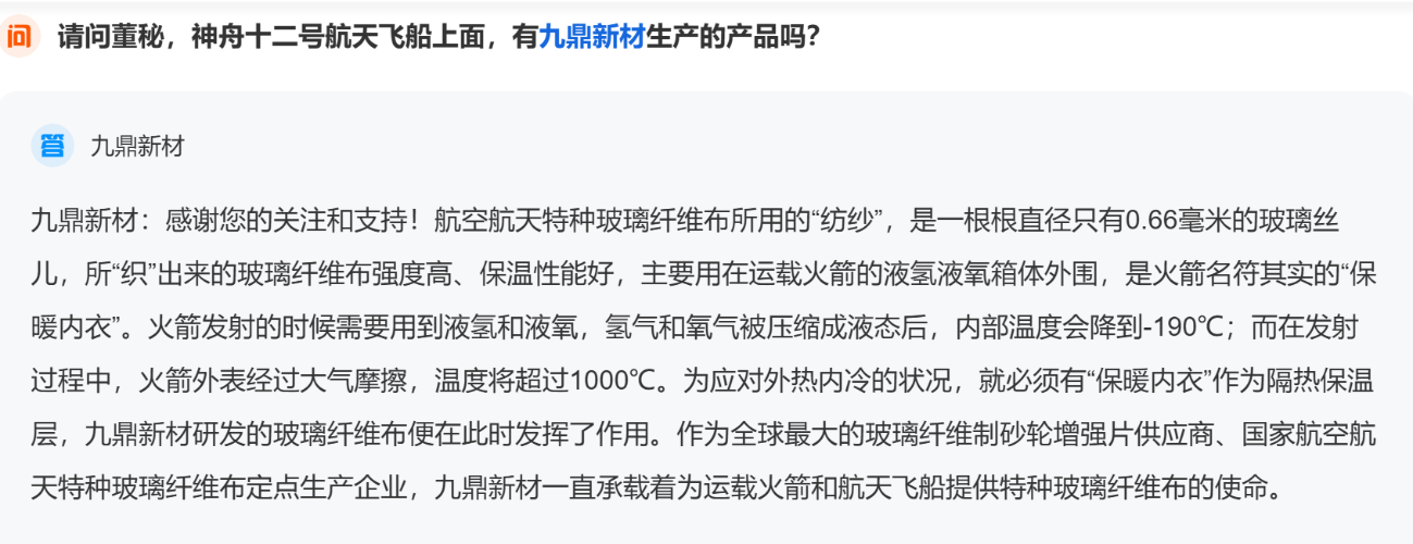 请问董秘,神舟十二号航天飞船上面,有九鼎新材生产的产品吗?