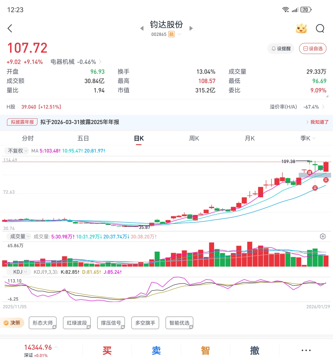 $钧达股份(SZ002865)$ 前天涨停板打板进入,109.38,昨天今天又105加仓,操作水平一塌糊涂,加仓为什么不在96 97加呢?真的鄙视自己。二次封不住板特别害怕,请问现在刚刚回本,是拿还是出呢?各位朋友给个建议。。感谢!
