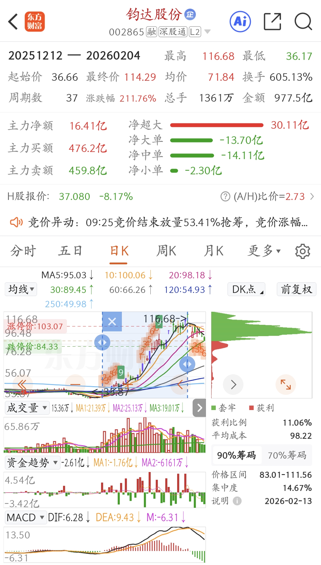 从12月12日到2月4日,37个交易日主力资金累计流入16.41亿。从2月5日到