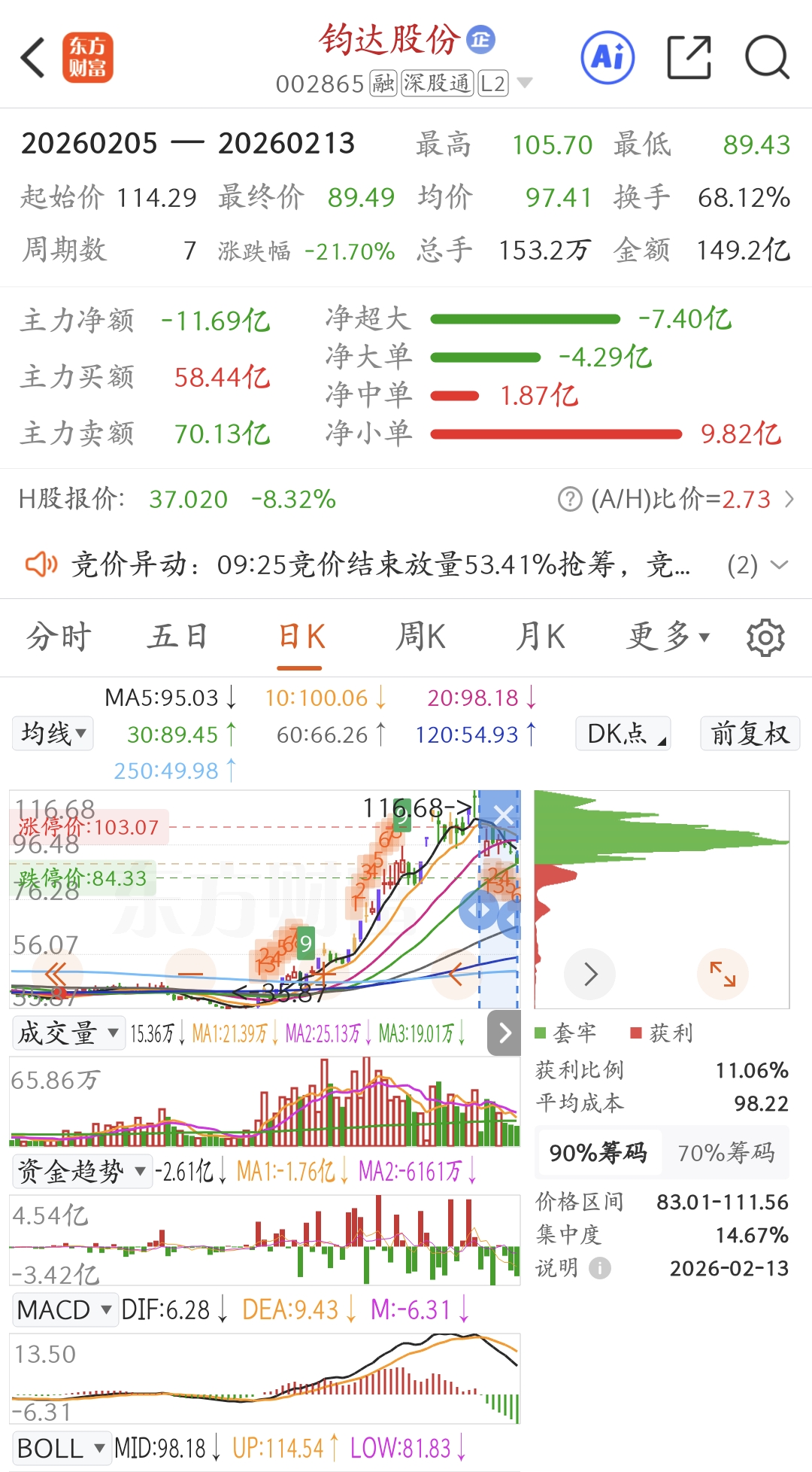 #复盘记录# 从12月12日到2月4日,37个交易日主力资金累计流入16.41亿。从2月5日到2月13日,7个交易日主力资金累计流出11.69亿。主力出货超过一半,预计年后还有二浪。