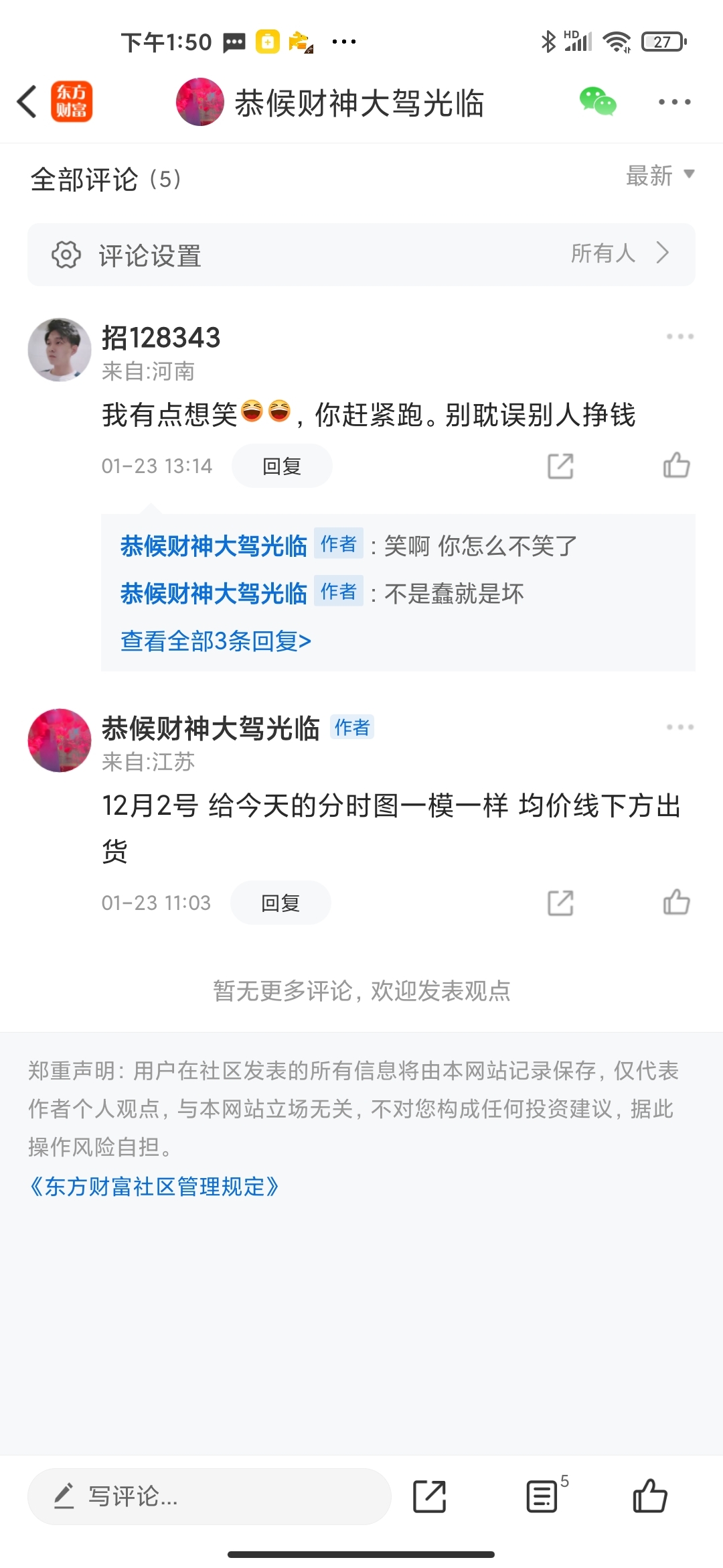温馨提示: 1.根据《证券法》规定,禁止编造、传播虚假信息或者误导性信息,扰乱证券市场;2.用户在本社区发表的所有资料、言论等仅代表个人观点,与本网站立场无关,不对您构成任何投资建议。用户应基于自己的独立判断,自行决定证券投资并承担相应风险。《东方财富社区管理规定》
