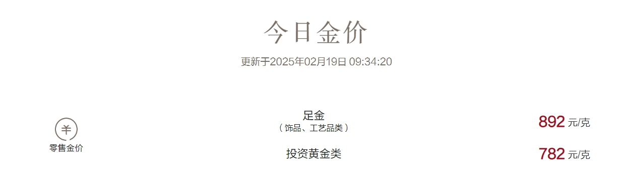 2月19日,周大生、周大福、六福珠宝等品牌的足金饰品价格达到892元/克。与前一日相比,周大生的黄金价格上涨了17元/克。