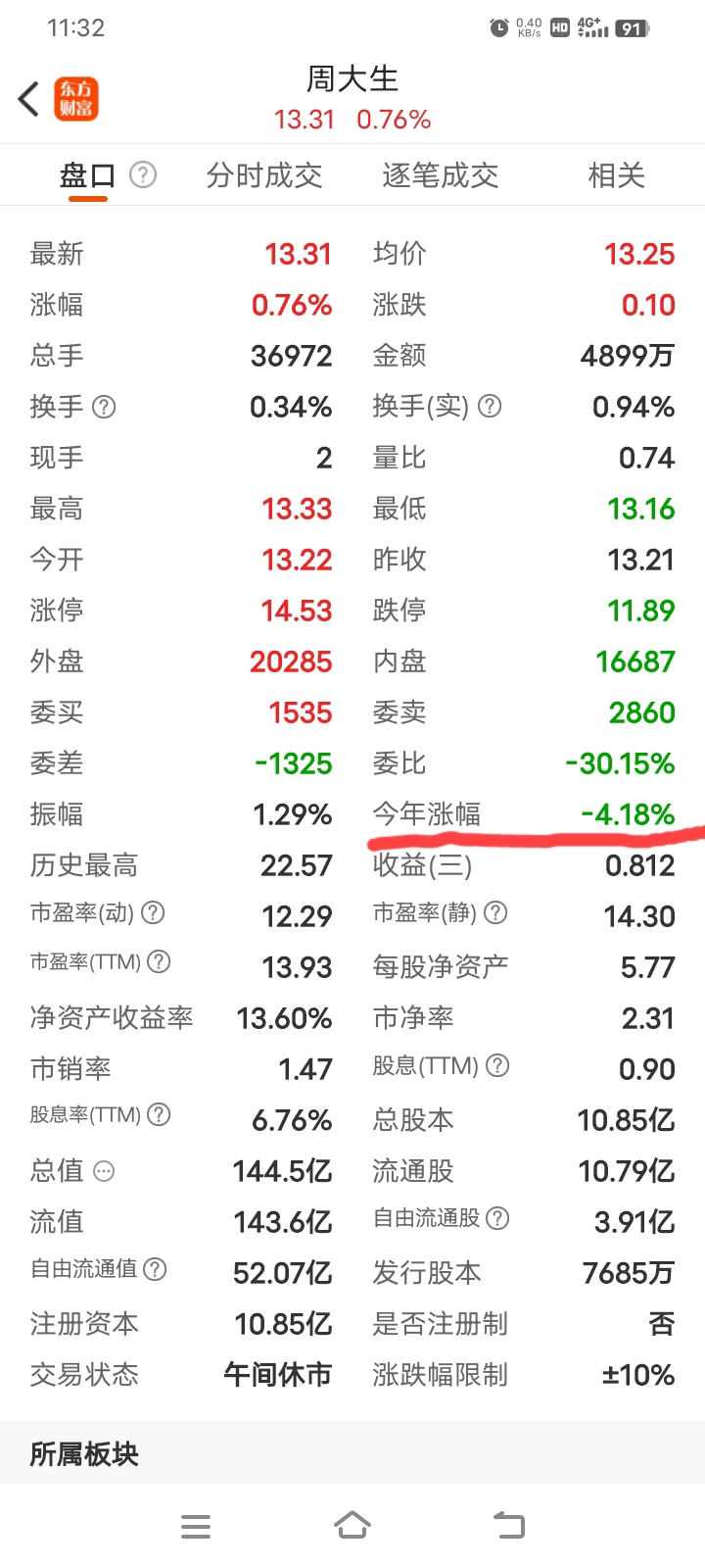 $周大生(SZ002867)$ 今年以来大盘涨了那么多,大家都赚钱了吧?为什么周大生的涨幅-4.18%。我看业绩也相对来说还算不错吧?这算不算低洼,而且股息率那么高,适合避险资金配置。