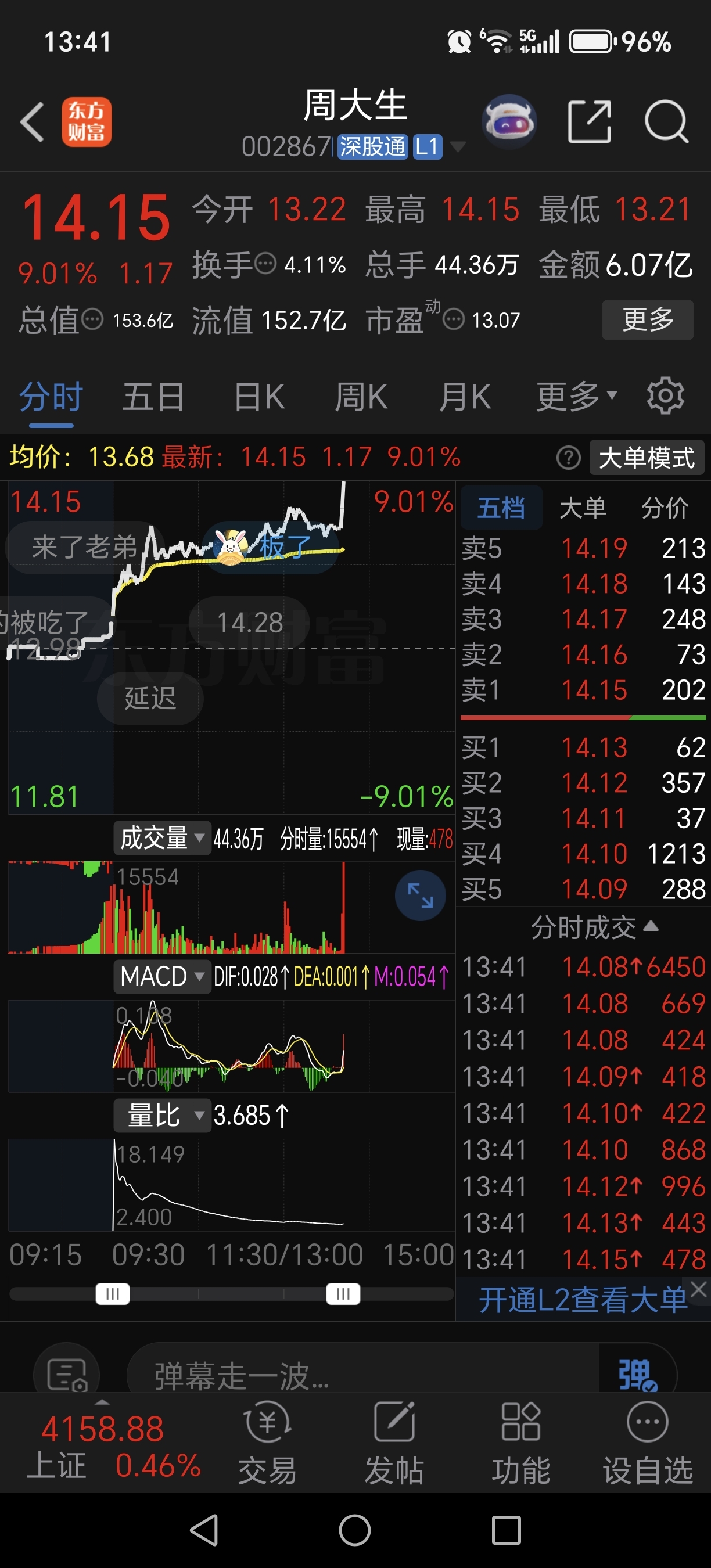 $周大生(SZ002867)$ 要发力涨停了吗?
