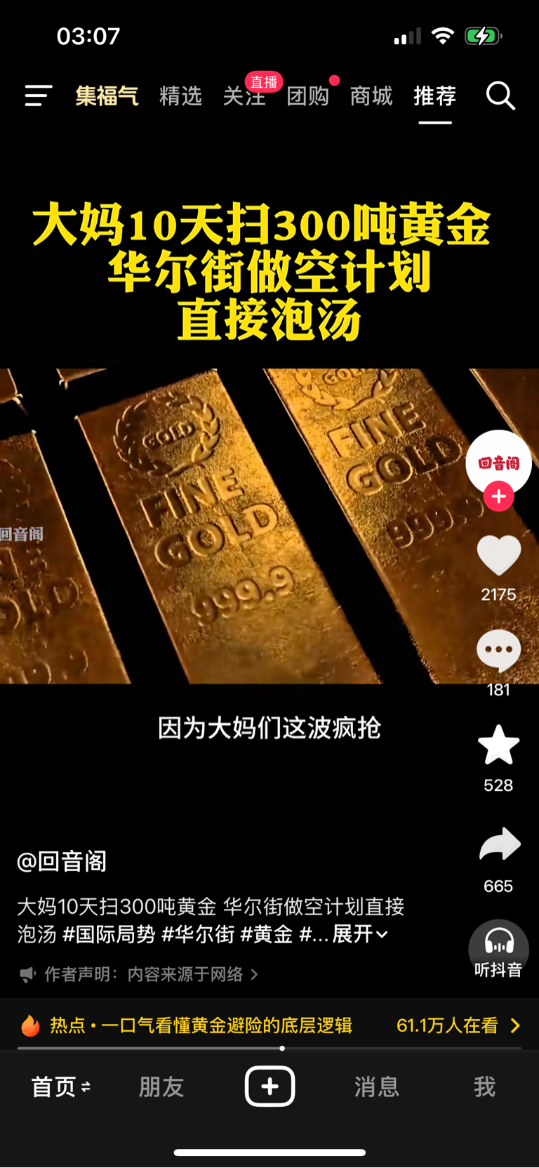 $周大生(SZ002867)$ 10年前,华尔街做空黄金,中国大妈知道实物黄金便宜了。拼命买黄金,买了300吨黄金。金店银行都卖空了。反而稳定了金价。华尔街为了江中国大妈黄金吐出来。谎说大话妈买黄金放着亏深套的,殊不知黄金首饰大妈们是当传家宝给子孙后代儿子媳的。涨跌了无关的。觉得当时黄金便宜了是捡便宜了。迫使华尔街做空爆仓。