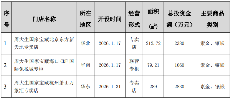 周大生1月新增3家门店 总投资达6270万元