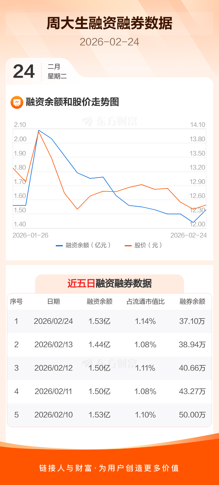 交易所最新数据显示,周大生于2026年2月24日获融资买入1815.92万元,融资偿还916.53万元,当日融资净买入899.4万元。目前,该股融资余额1.53亿,占流通市值比例为1.14%。