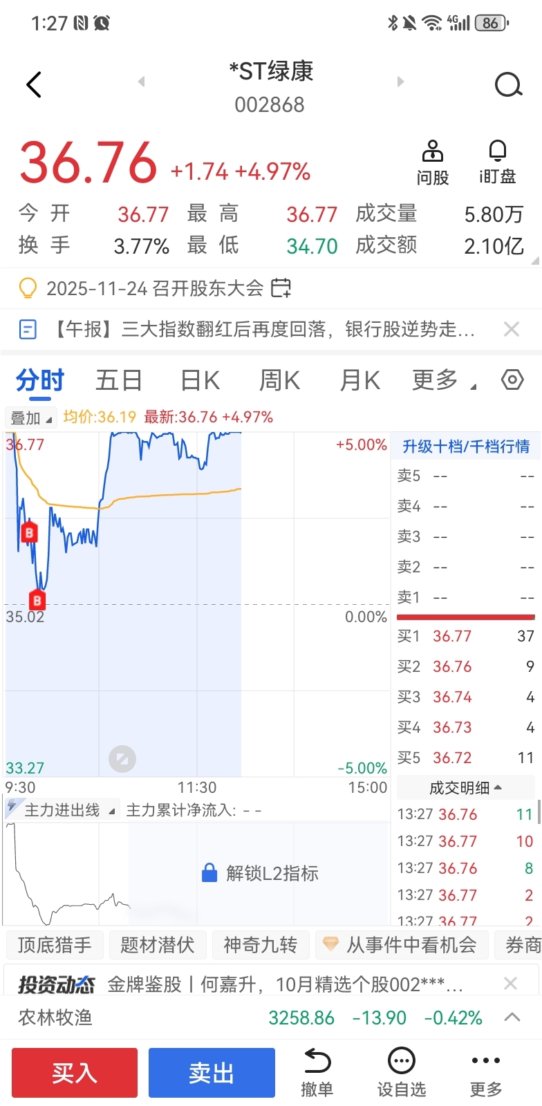 $*ST绿康(SZ002868)$ 未来百元股少不了你,难得开板,我来了