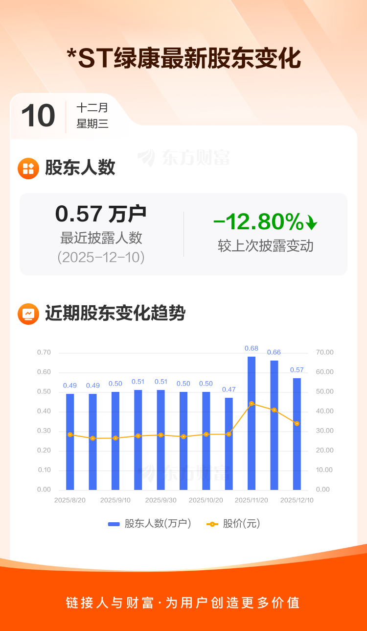*ST绿康最新披露数据显示,截至12月10日公司股东户数为5722户,较上期(2025年11月28日)减少840户,降幅为12.80%。户均持有流通股数量由上期的2.35万股上升至2.69万股,户均持股金额由上期的95.64万元减少至91.10万元。