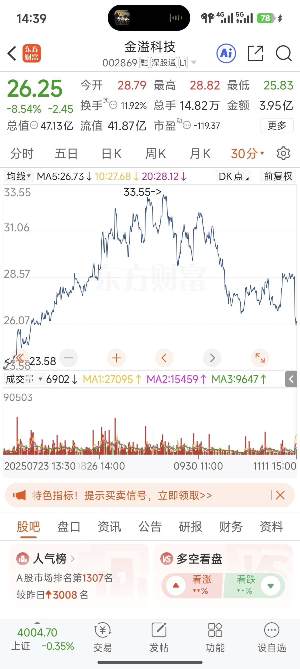 $金溢科技(SZ002869)$ 巨量!RSI14快40了