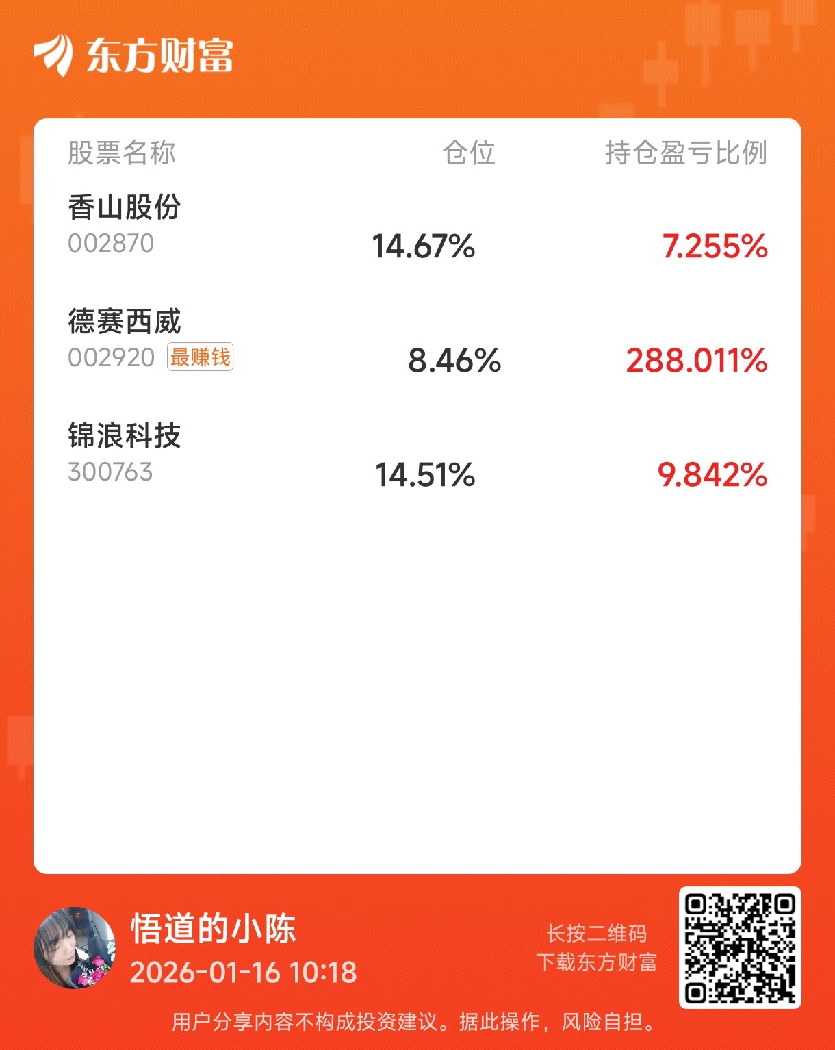 $香山股份(SZ002870)$ $锦浪科技(SZ300763)$ $德赛西威(SZ002920)$ 今天卖掉了昨天加仓的,只要不贪才能稳稳的攒钱