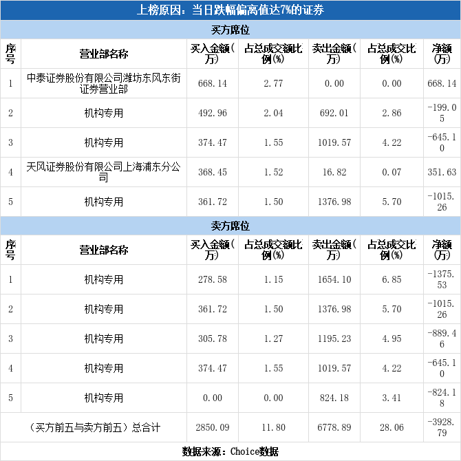 多主力现身龙虎榜,伟隆股份下跌7.72%(10-29)