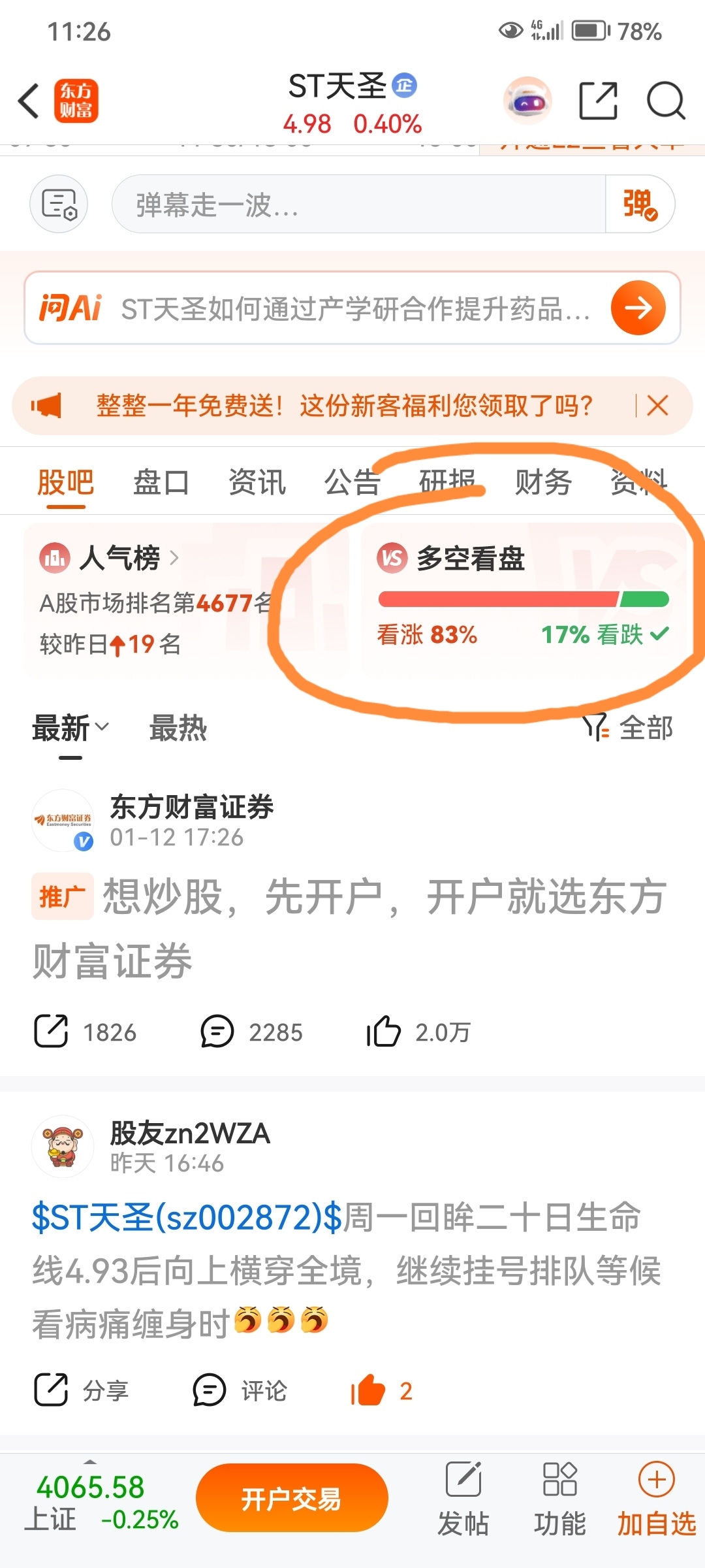 $ST天圣(SZ002872)$ 庄家无时无刻都在观察着股吧的温度,不要以为庄家不会到股吧里面来看,下面这个多空看盘庄家也会参考的,接下来会如何操盘!这也就是为什么当股吧一片唱多的时候,股价也会顺势下跌,完全并充分被庄家利用!所以对于晒图和截图我是极力反对的!可惜股吧里面没有人引起重视,仍然跟个砂子一样,不然股价可能早就起来了!