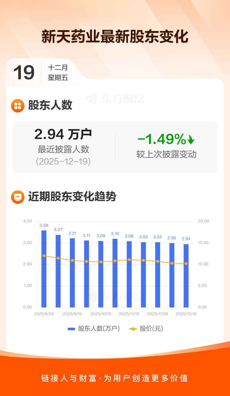 新天药业最新披露数据显示,截至12月19日公司股东户数为2.94万户,较上期(2025年12月10日)减少446户,降幅为1.49%。户均持有流通股数量由上期的7992股上升至8113股,户均持股金额由上期的8.21万元增加至8.27万元。