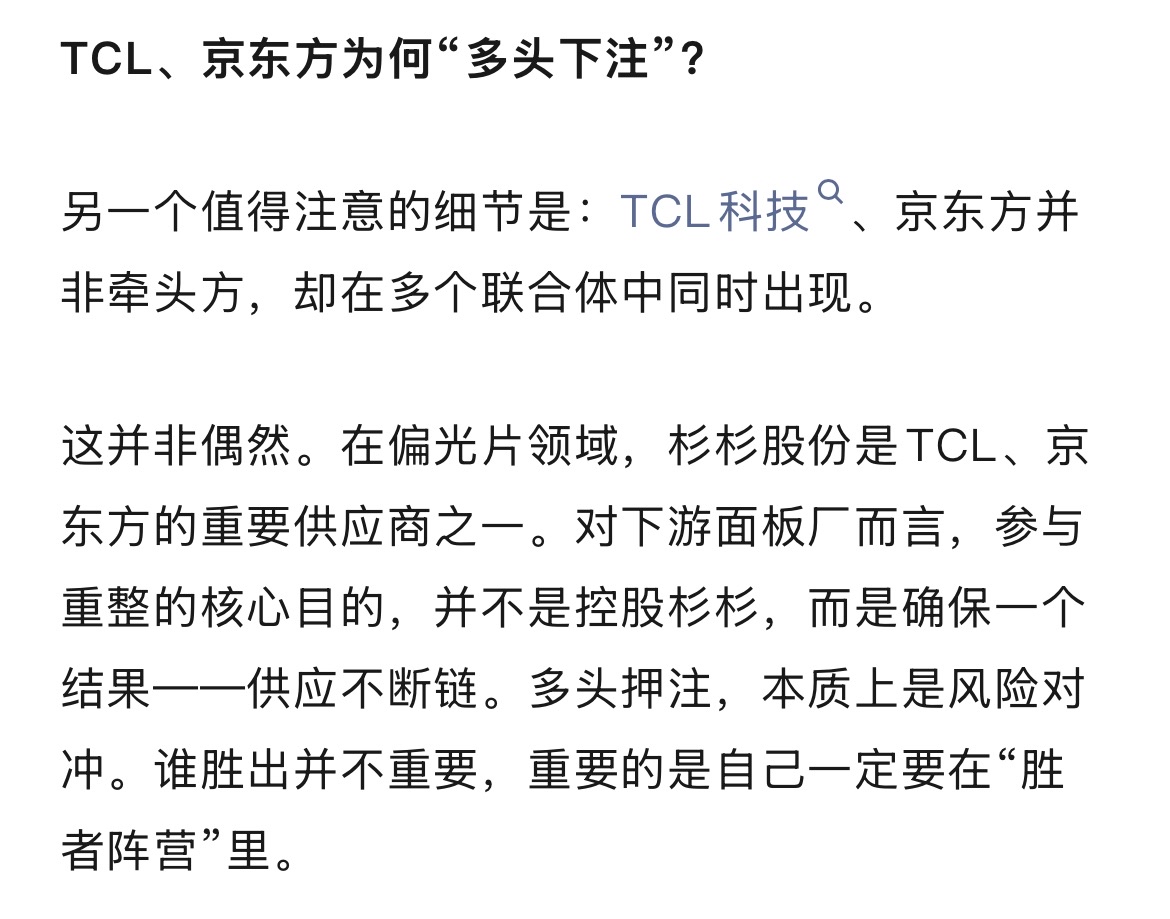 目前京东方和TCL核心目的就是能保住杉金光电不倒闭,保证上游原材料供应稳定,同时