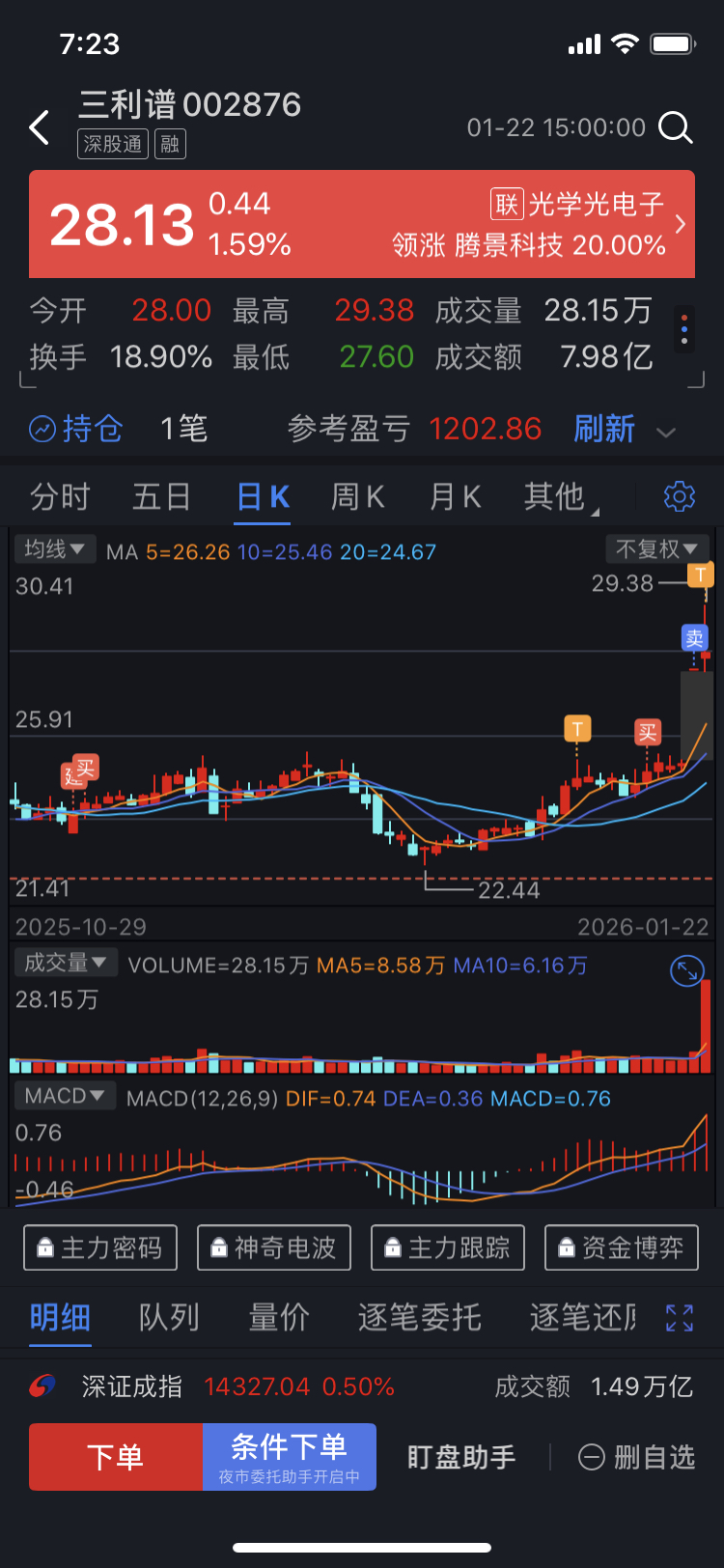$三利谱(SZ002876)$ 昨天卖出2手,买回1手,做了半个T,目前只剩1手继续格局下去。今天如果下杀就补1手。