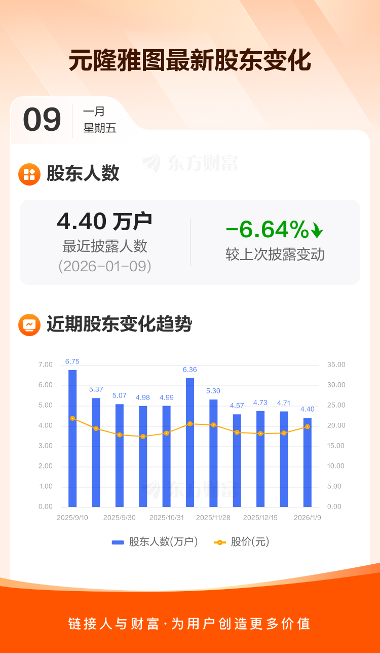 元隆雅图:截至1月9日最新股东户数4.40万户,较上期减少6.64%