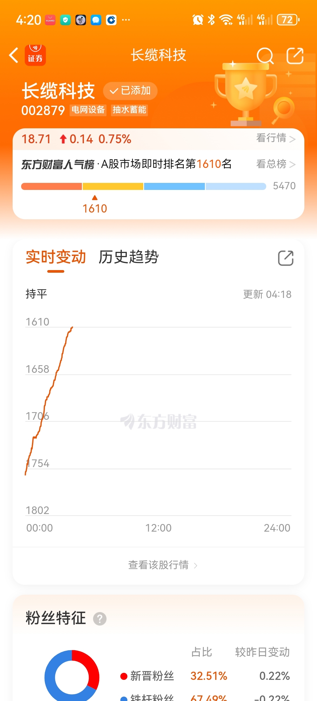 $长缆科技(SZ002879)$ 牛逼!这个票人气上升比航天发展还快!今天要大涨!