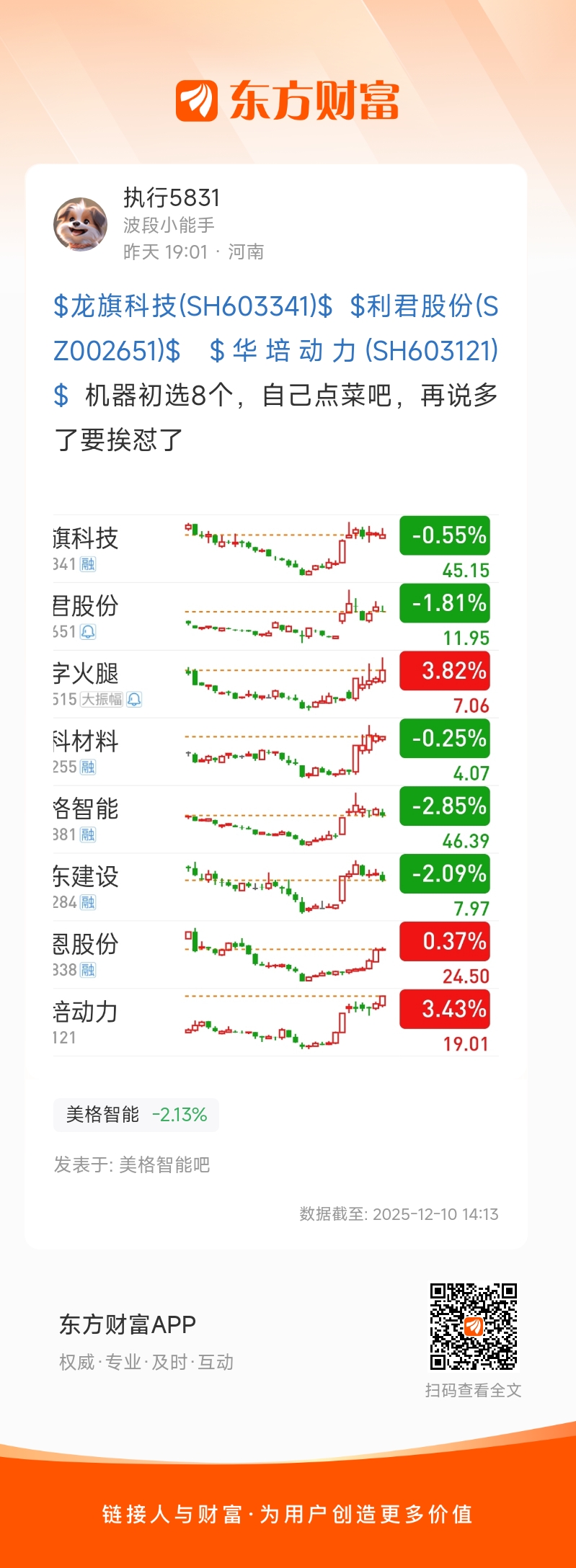 $龙旗科技(SH603341)$ $利君股份(SZ002651)$ $华培动力(SH603121)$ 机器初选8个,自己点菜吧,再说多了要挨怼了