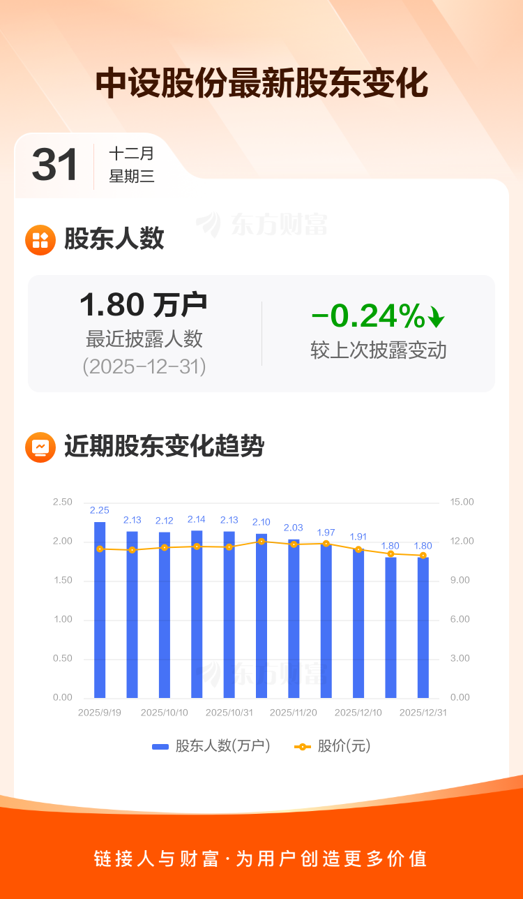 中设股份:截至12月31日最新股东户数1.80万户,较上期减少0.24%