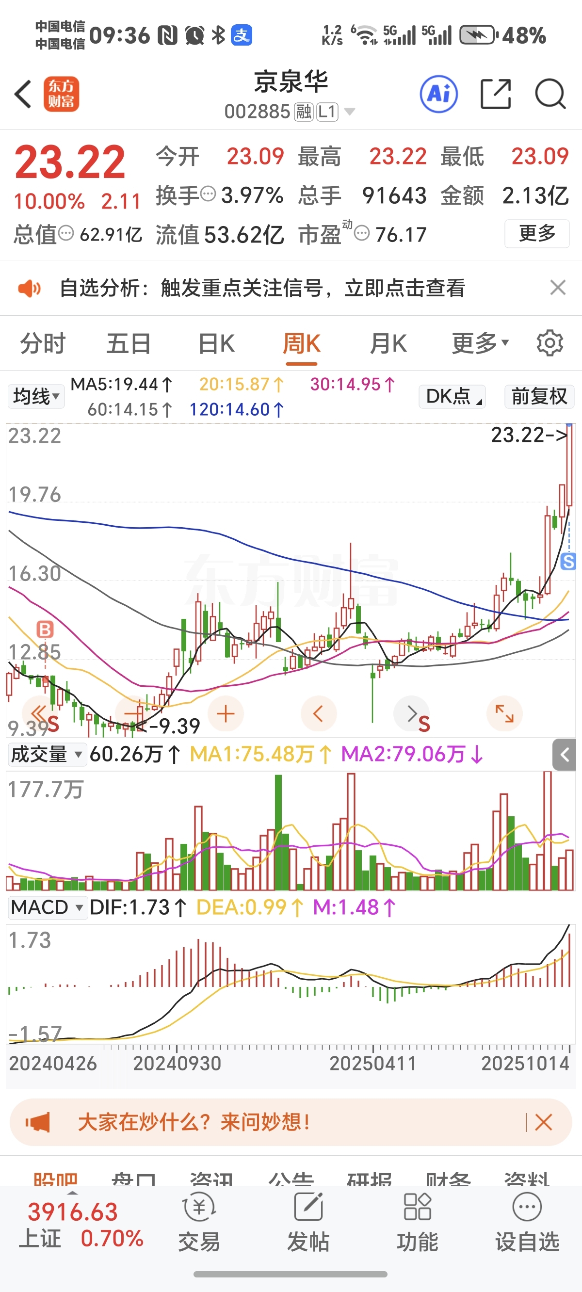 $京泉华(SZ002885)$ 12的本,今天走一半,看着有减持,不然不会走,让利润在飞一会!