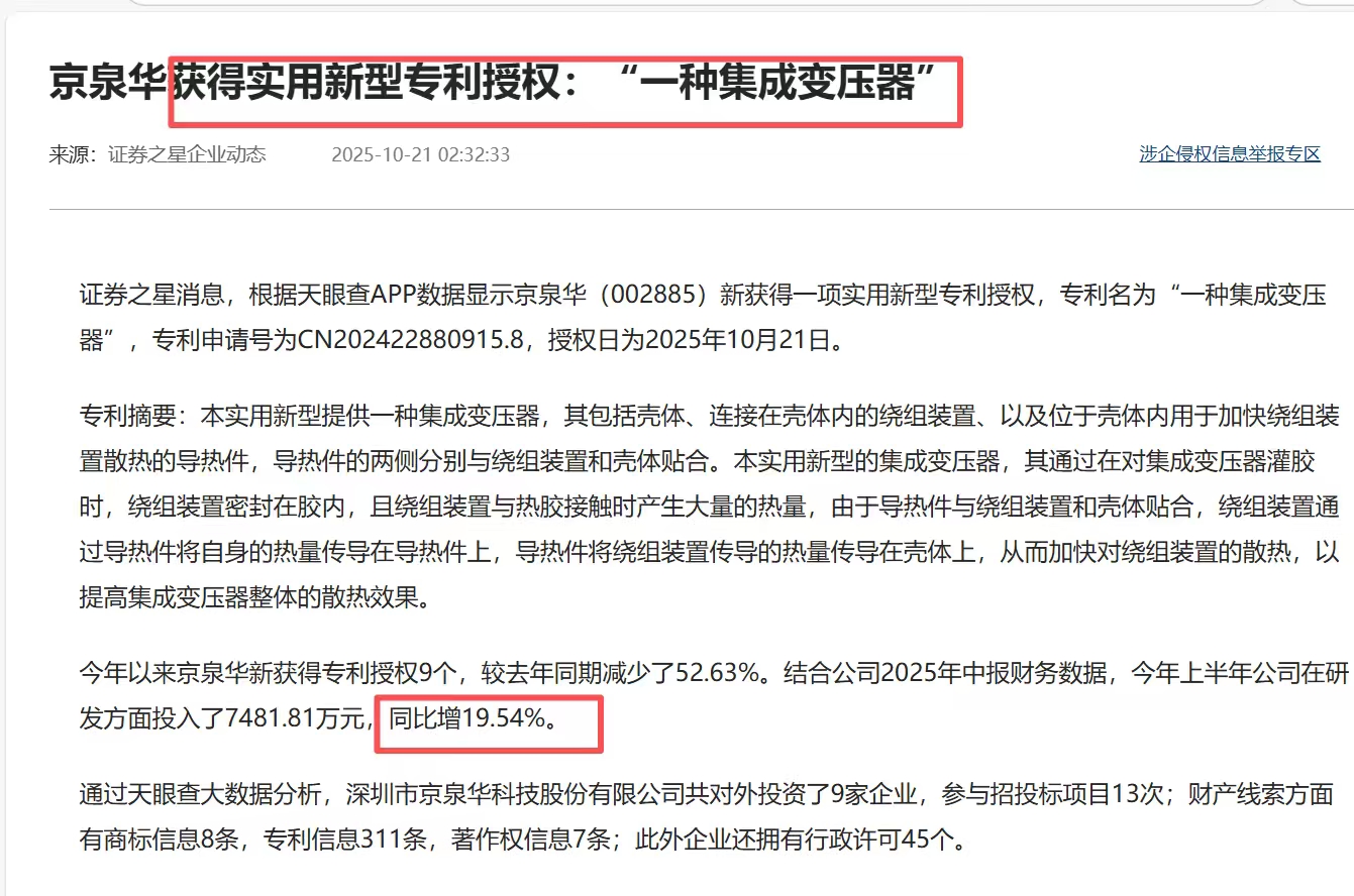 $京泉华(SZ002885)$ 公司持续投入研发,上半年研发费用同比增长19.54%,并不断有像“集成变压器”这样的新专利获得授权。这说明公司注重通过技术创新来提升产品竞争力和毛利率,这是在电子制造行业立足的长久之道。