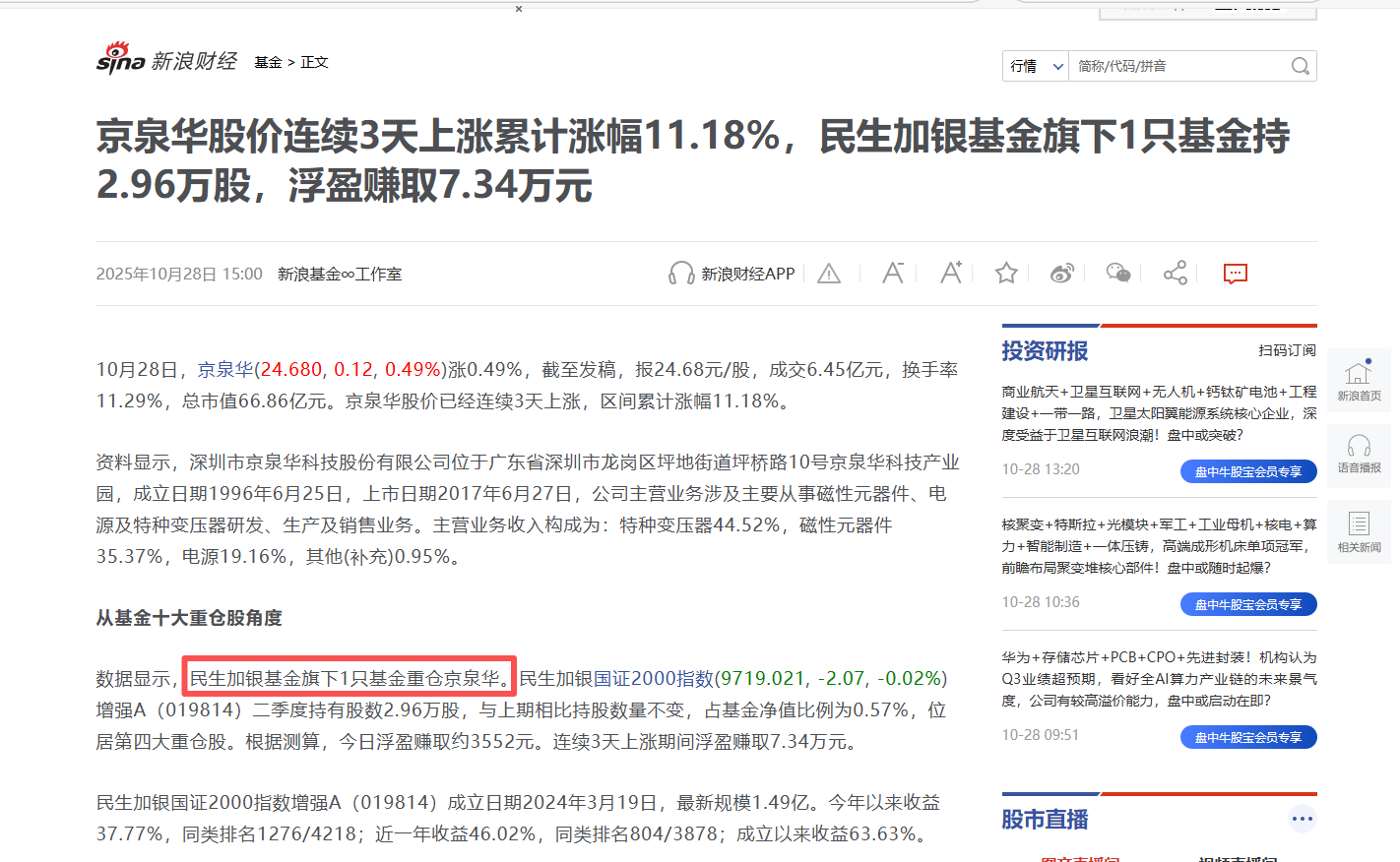 民生加银基金旗下产品重仓持有京泉华,说明专业机构认可其投资价值。