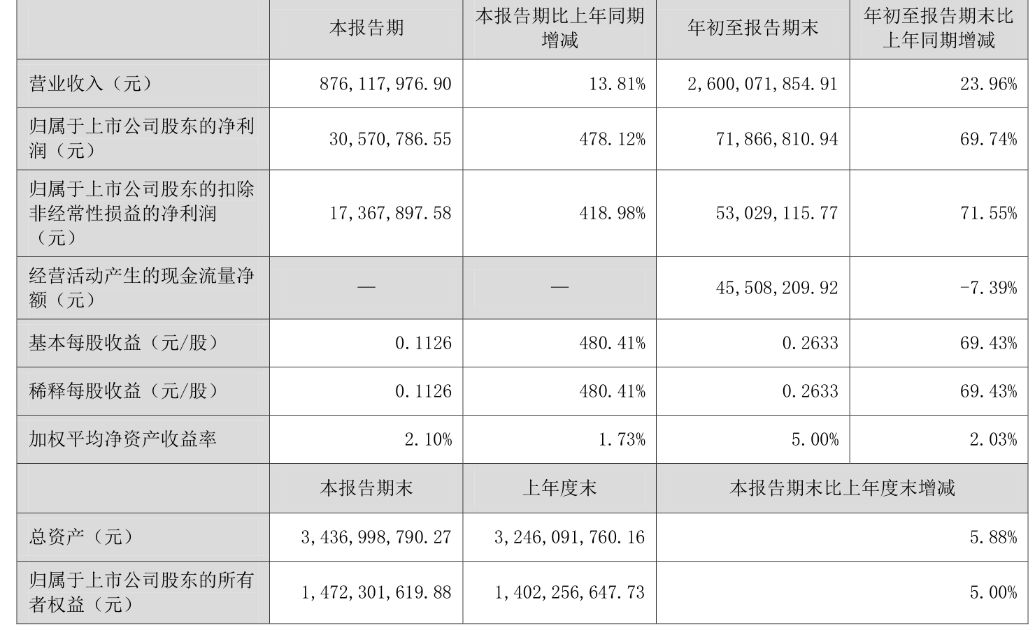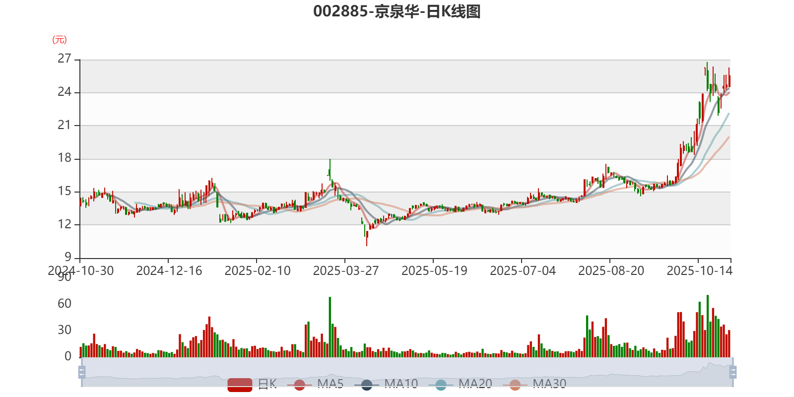 中证智能财讯京泉华(002885)10月30日披露2025年第三季度报告。前三季度公司实现营业总收入26亿元,同比增长23.96%;归母净利润7186.68万元,同比增长69.74%;扣非净利润5302.91万元,同比增长71.55%;经营活动产生的现金流量净额为4550.82万元,同比下降7.39%;报告期内,京泉华基本每股收益为0.2633元,加权平均净资产收益率为5.00%。